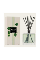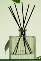 Scented, light green-tinted reed diffuser oil housed in a glass vessel etched with elegant, frosted stripes
