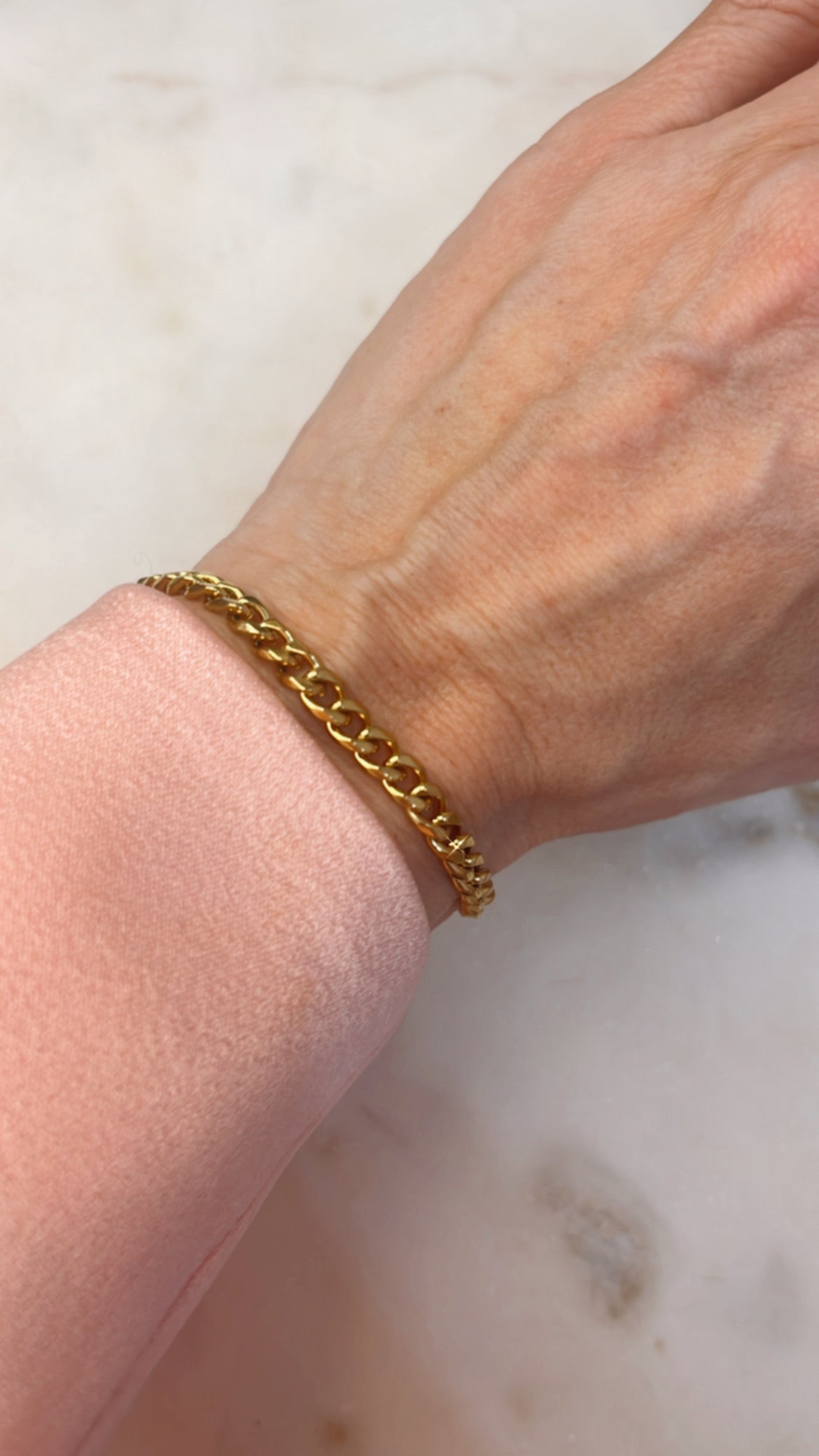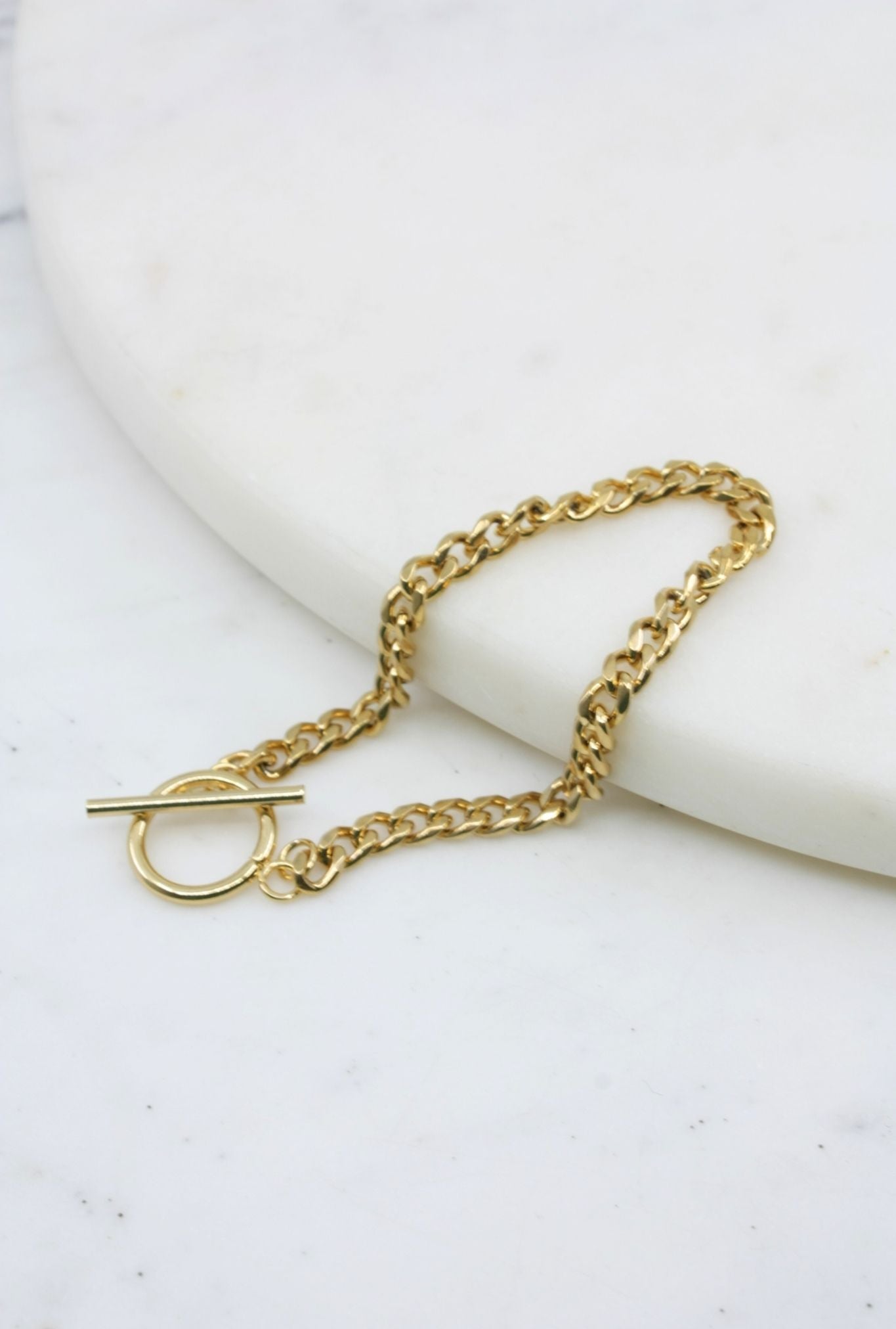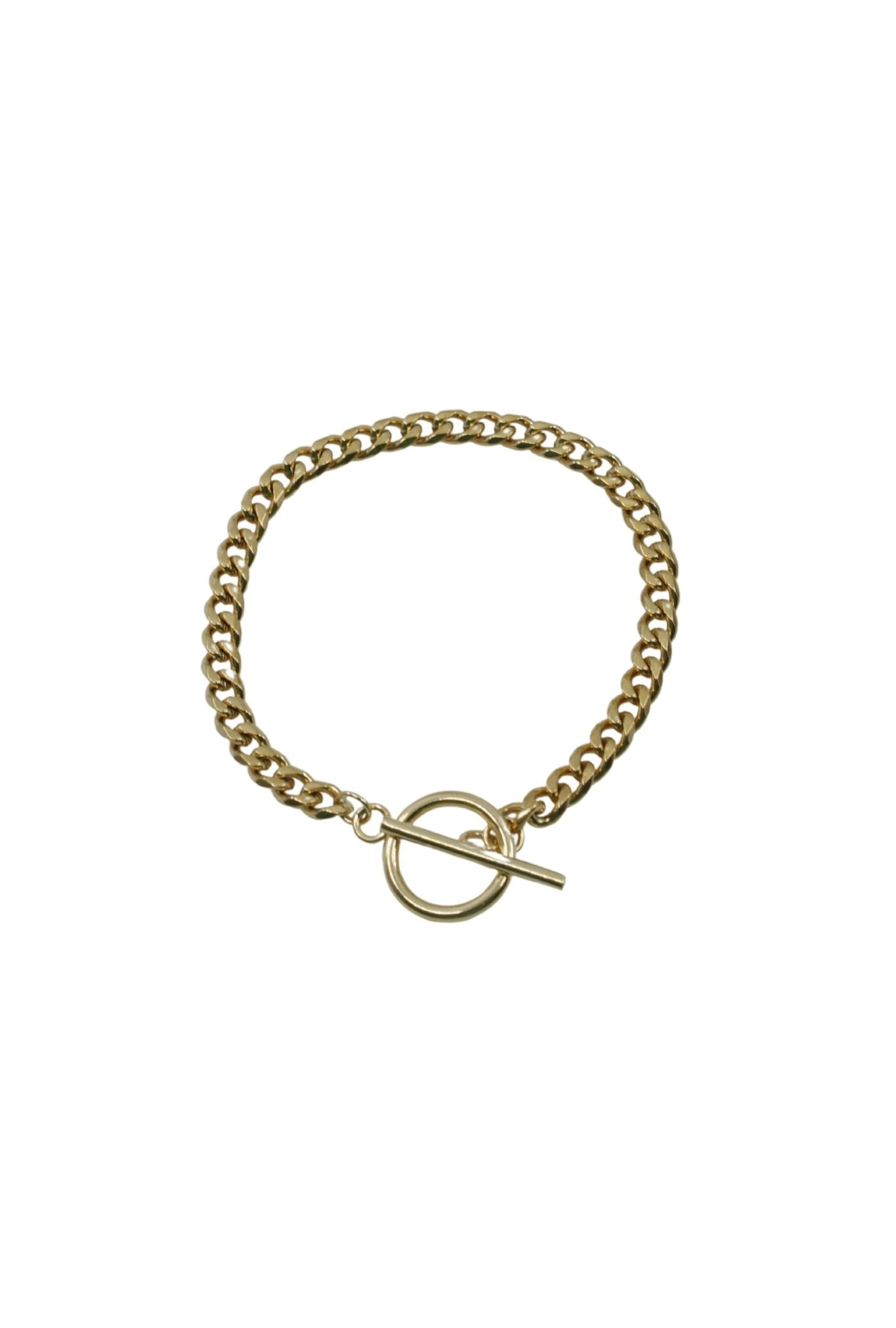 A curb chain bracelet with a lariat style closure. Available in gold.
