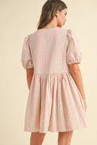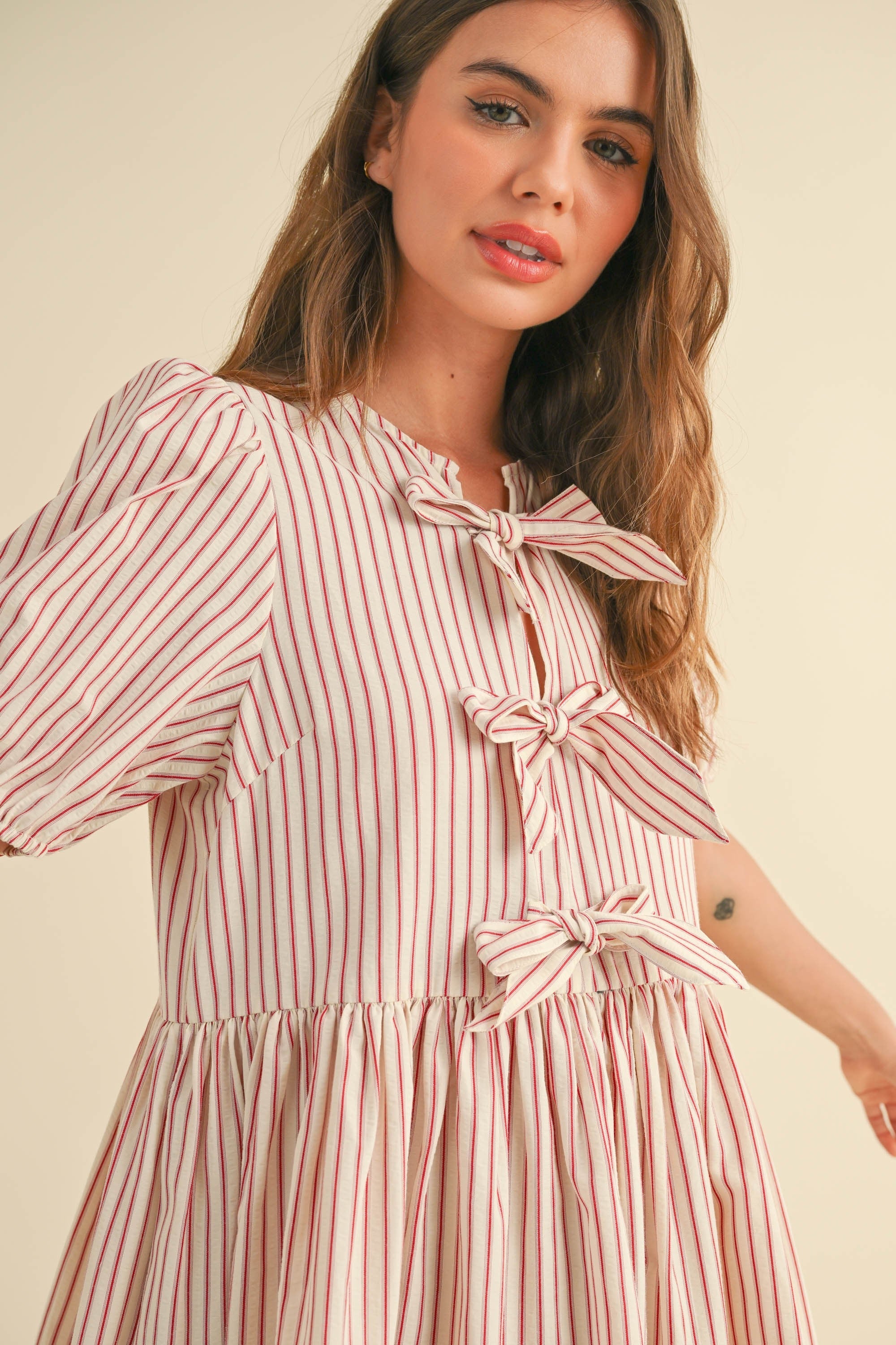 Embrace a touch of vintage charm with this playful babydoll dress. Featuring delicate red and white stripes, this dress has a flattering A-line silhouette with gathered tiers for extra volume and movement. The puff sleeves add a whimsical touch, while the adorable bows down the front elevate the overall look with a sweet, feminine detail. Perfect for sunny days out or casual gatherings, this dress pairs beautifully with sandals or sneakers for effortless style.