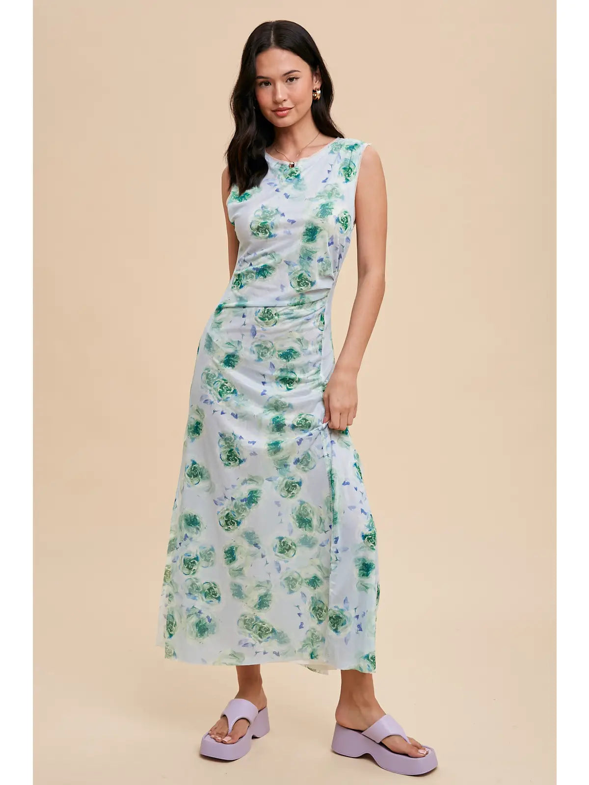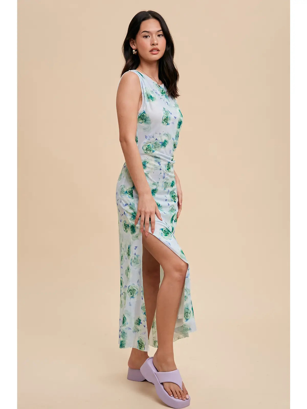 Mesh dress features a watercolor rose print fabrication, boat neckline, double raw edge accents, reverse seam asymmetrical stitch, slide slit and full lining.