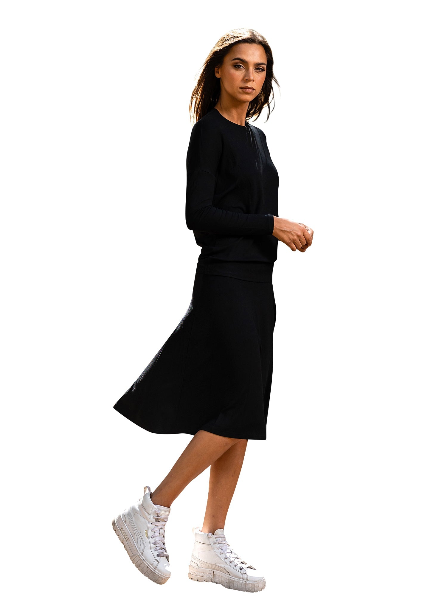 This skirt is designed to skim the body without being too tight. The material has a slight stretch but not clingy. Skirt covers knees. We recommend ordering your usual size.