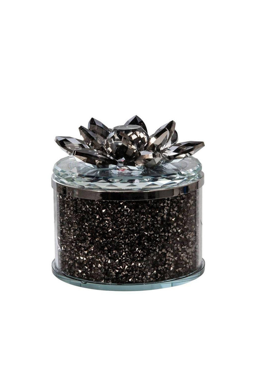 This gorgeous lotus box is a unique piece for any space in your home. Adorned in a dark crystal "Smoke" color pallet. Featuring a crystal lid and sparkling base, add it to an end table or incorporate it into a centerpiece. Great for holding trinkets too! Size: 4”.