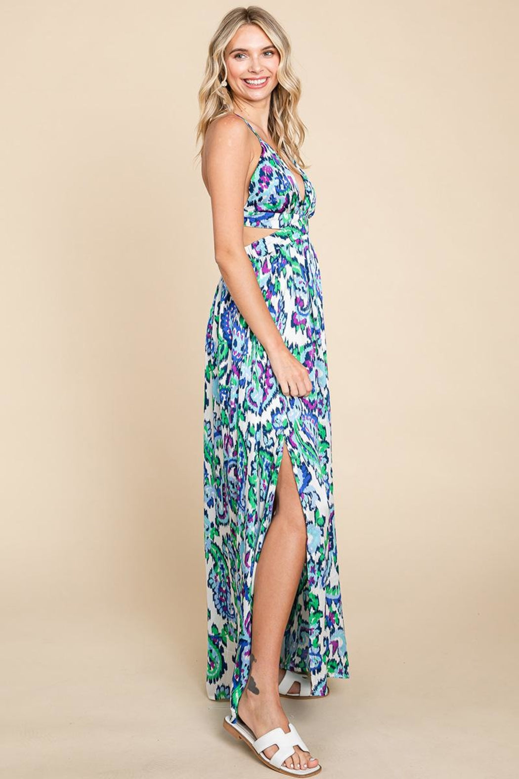 Features: Sleeveless, Depp V neck, Printed, Adjustable Spaghetti Strap, Side Cut Out, Open Tie Back, Partially Lined, Sleeveless, Boho Style, Split Hem, Maxi Length