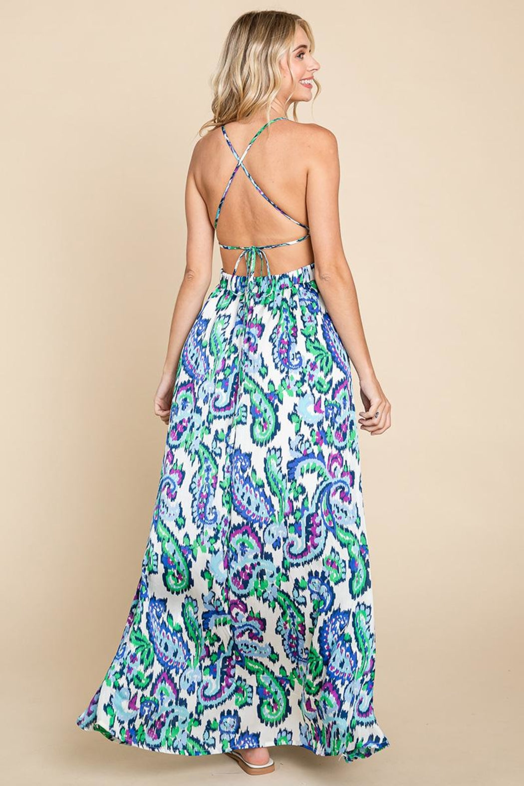Deep V Neck Open Back Printed Boho Maxi Dress