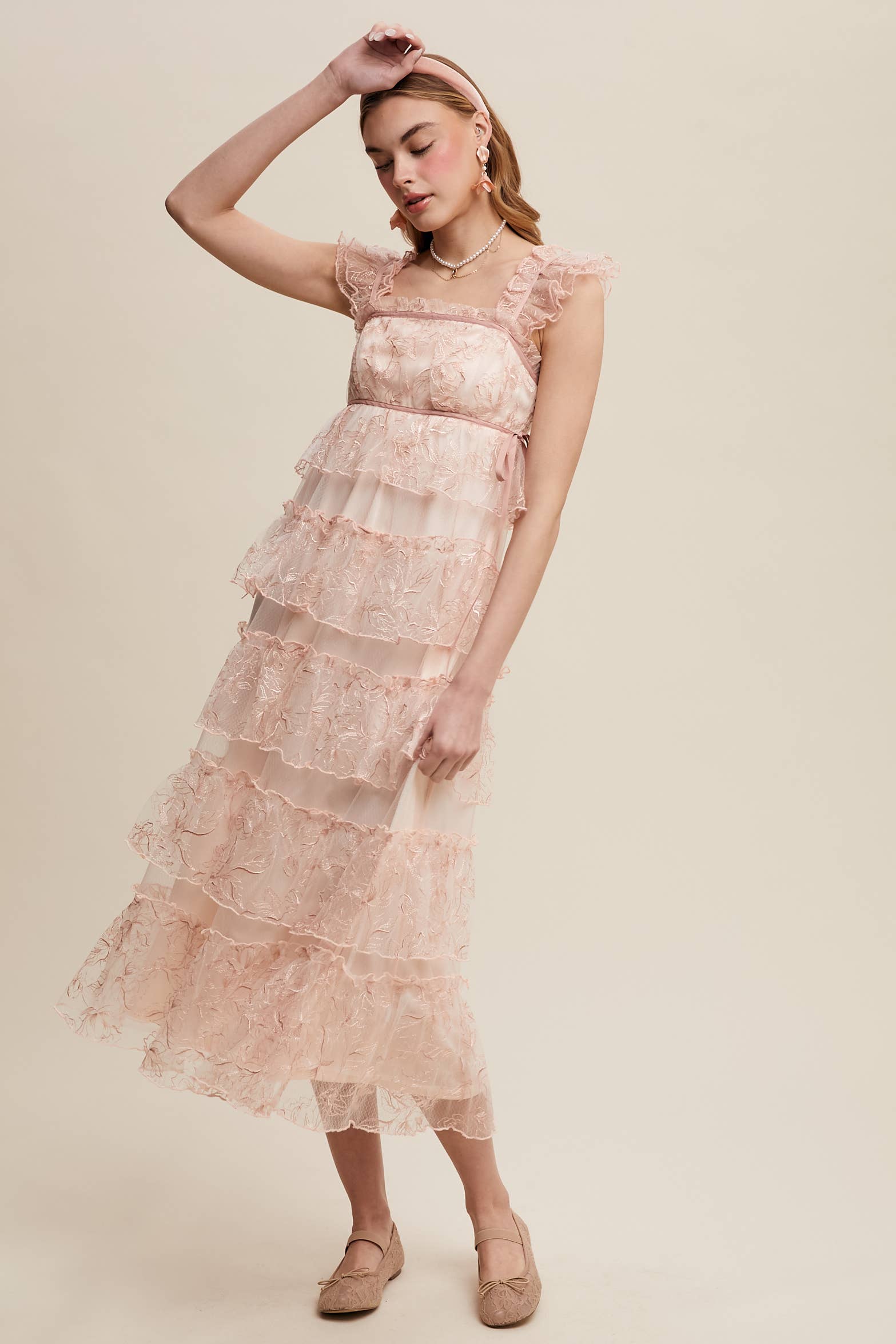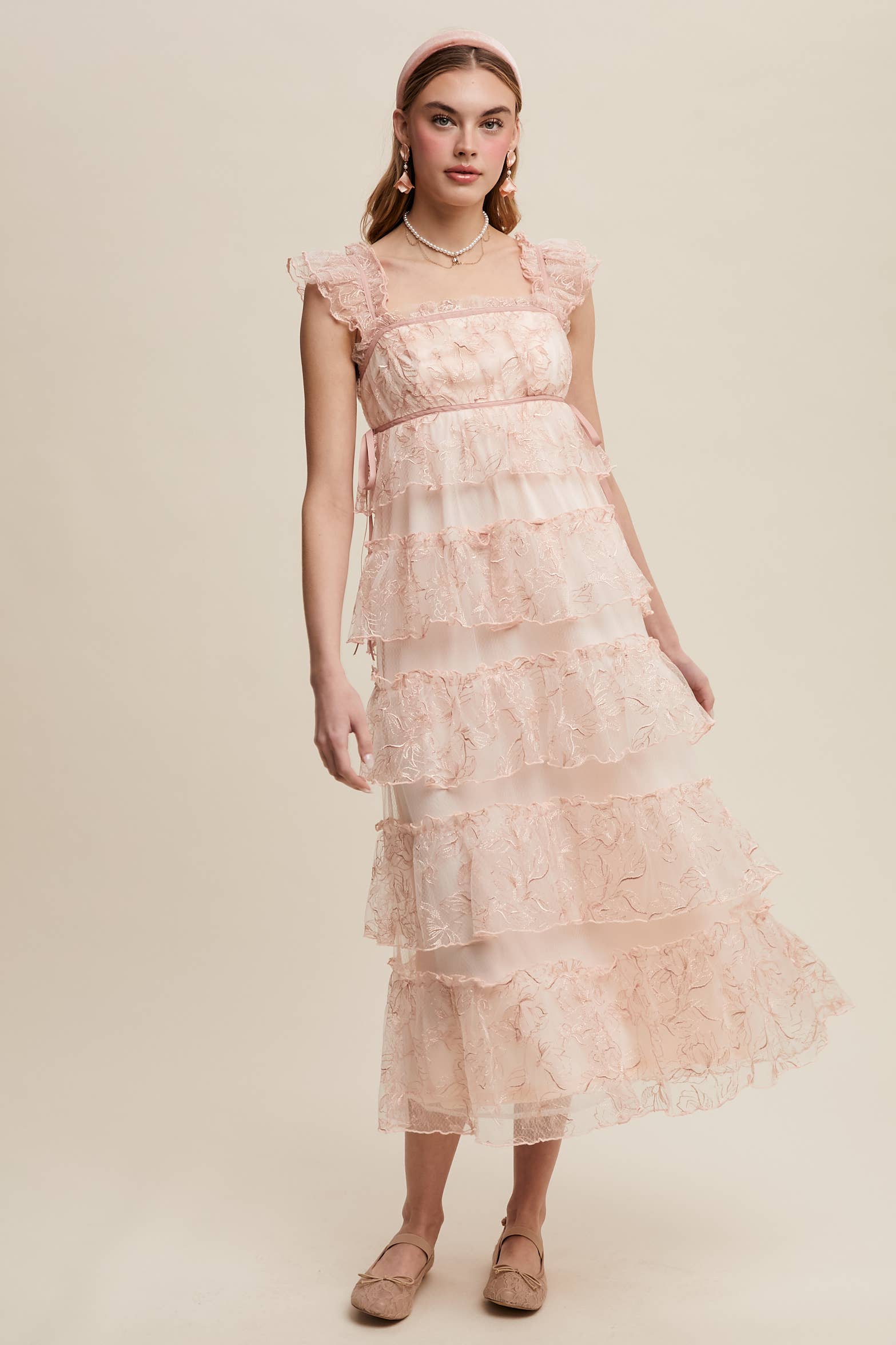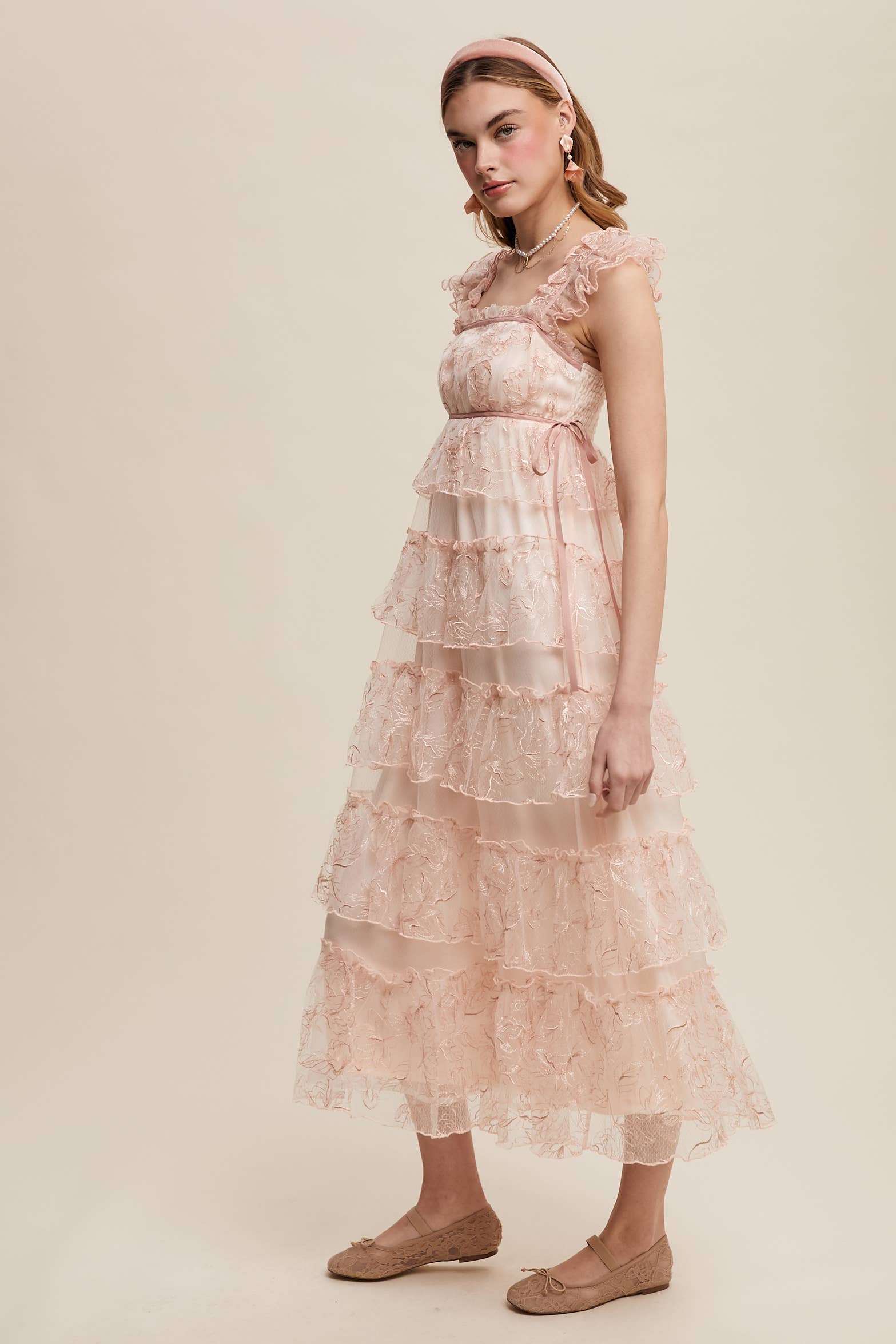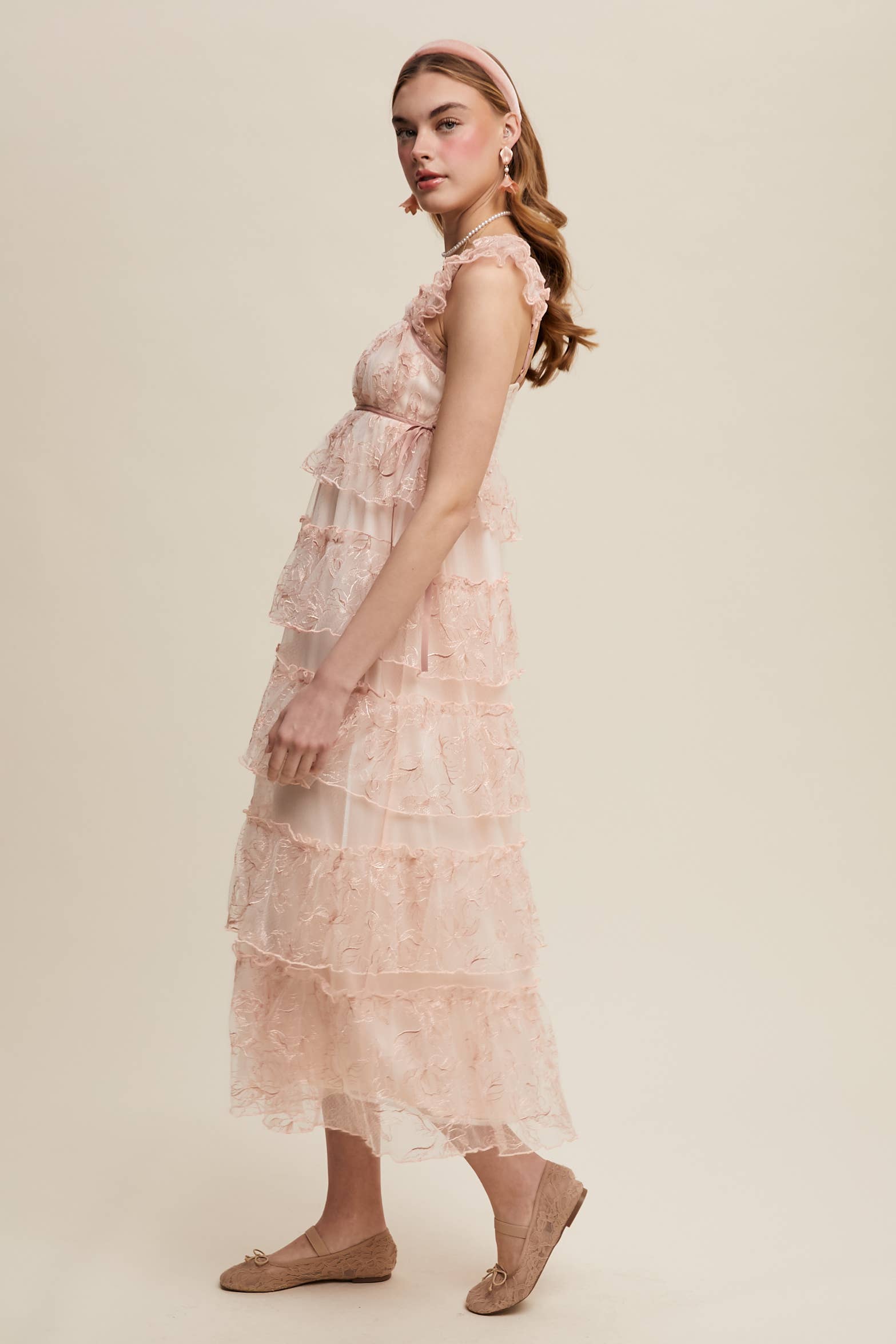 Delicate Floral Embroidered Lace Maxi Dress: Mute Pink