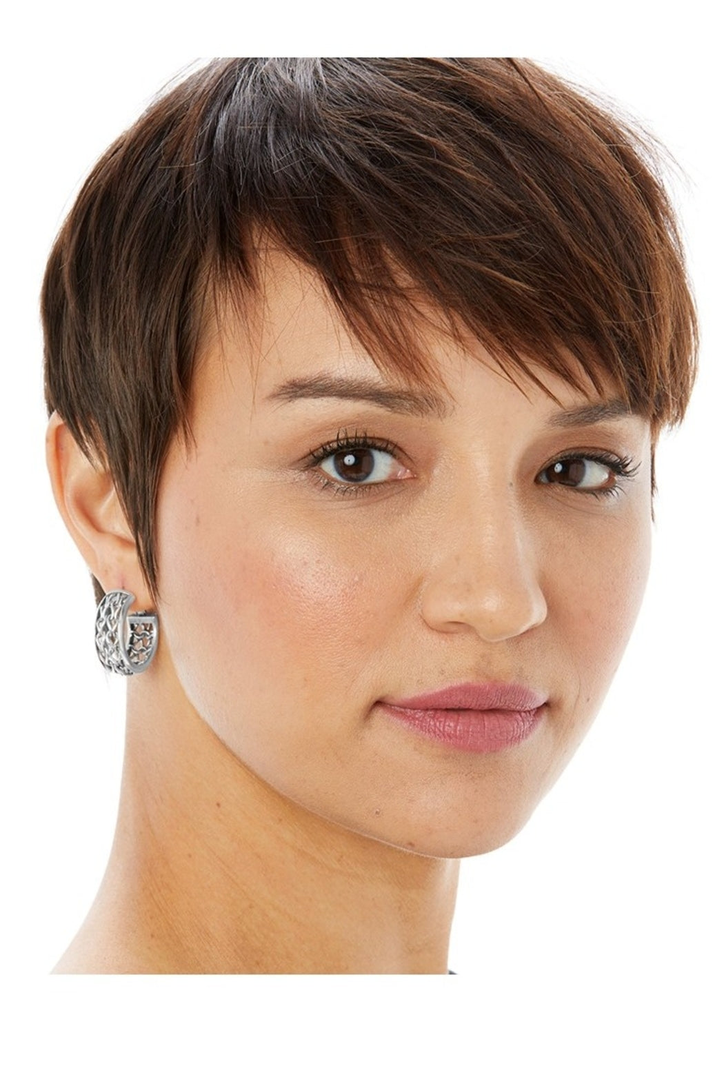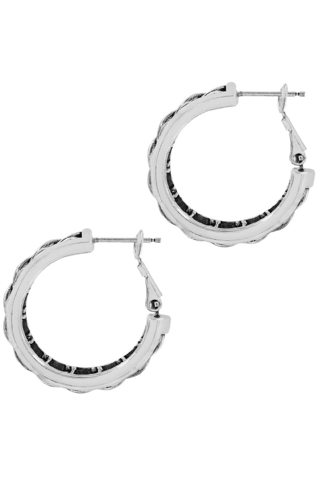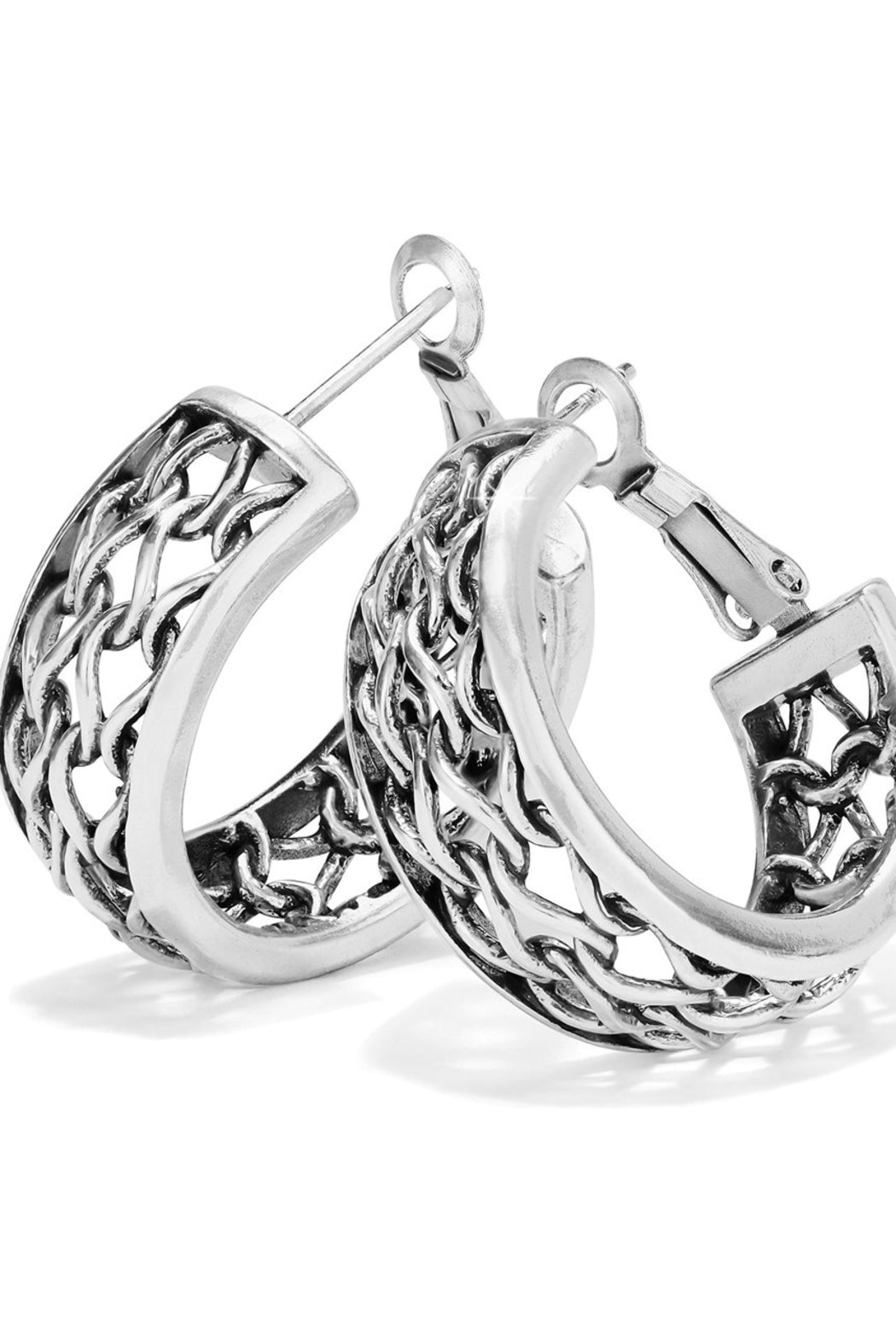 A new everyday hoop made up of an intricate woven pattern. Collection: Delicate Memories Color: Silver Type: Post with Lever back Width: 3/8" Drop: 1" Finish: Silver plated