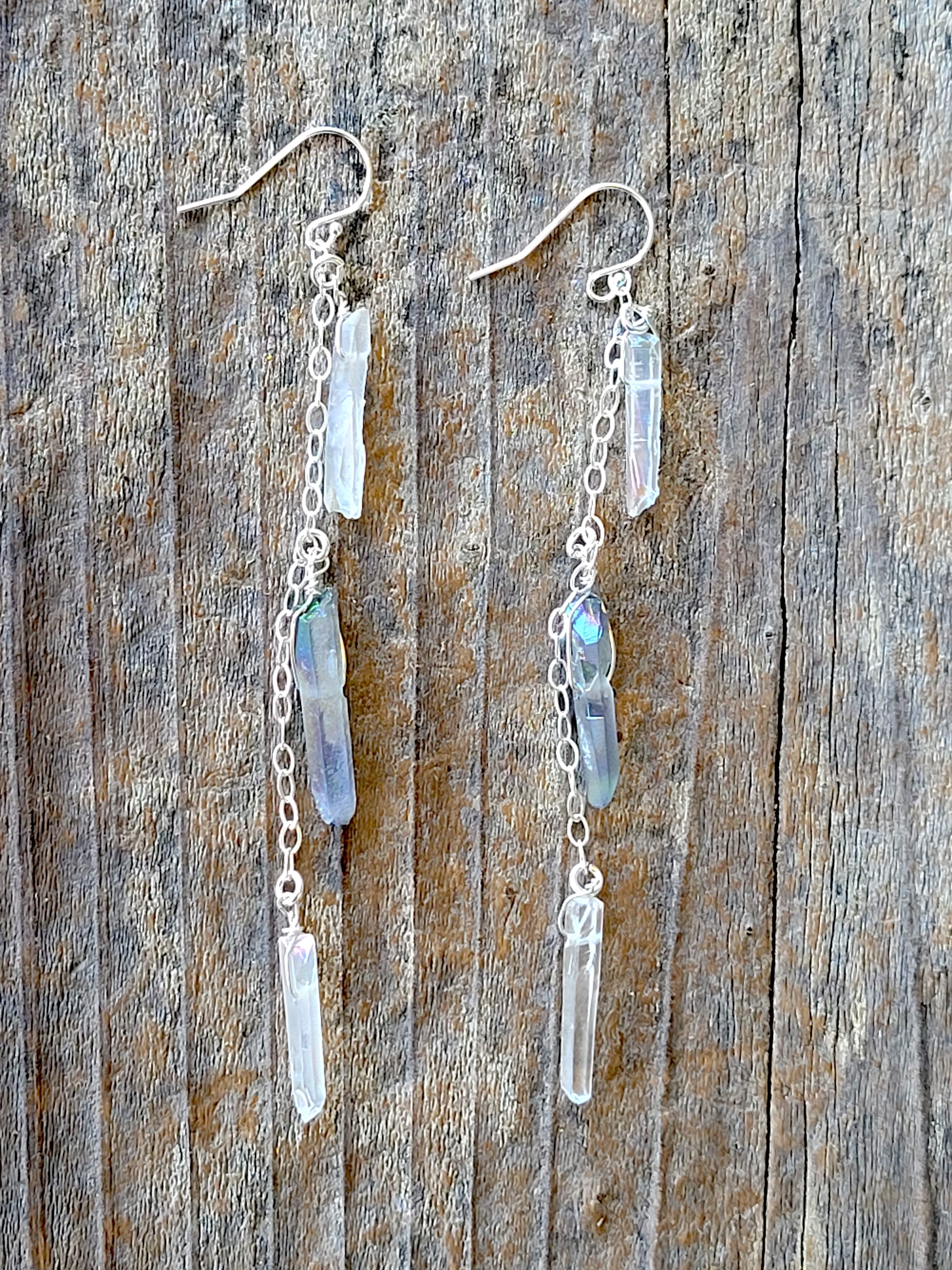 Delicate silver chain dangle earring with three raw quartz crystals, from rainbow quartz at the top, mystic grey quartz in the middle, to rainbow quartz at the bottom.