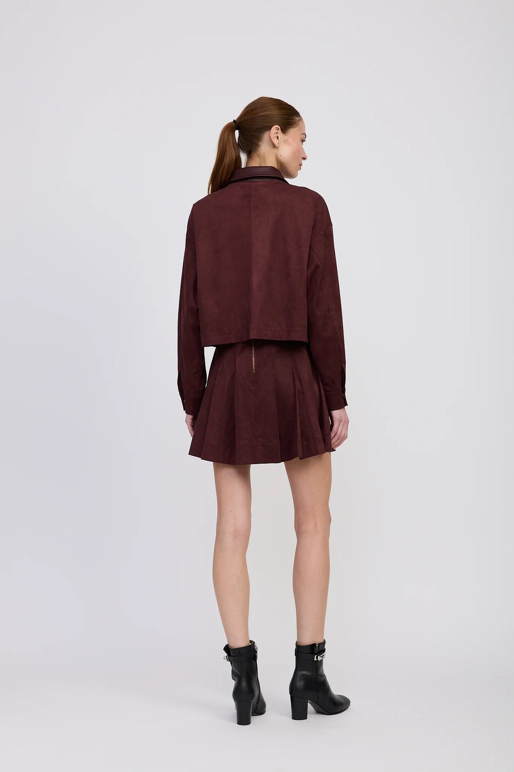 The perfect Fall statement jacket has arrived! Just in time for game days, parties or just because. This stunning faux suede jacket is featured in Fall's most coveted color: maroon! Style it over dresses or with jeans, the options are endless 90% Polyester 10% Spandex Faux Suede Oversized Drop Shoulder Boxy Jacket With Contrast Faux Leather Detailing Hand wash Model is 5'9 and wearing a size small
