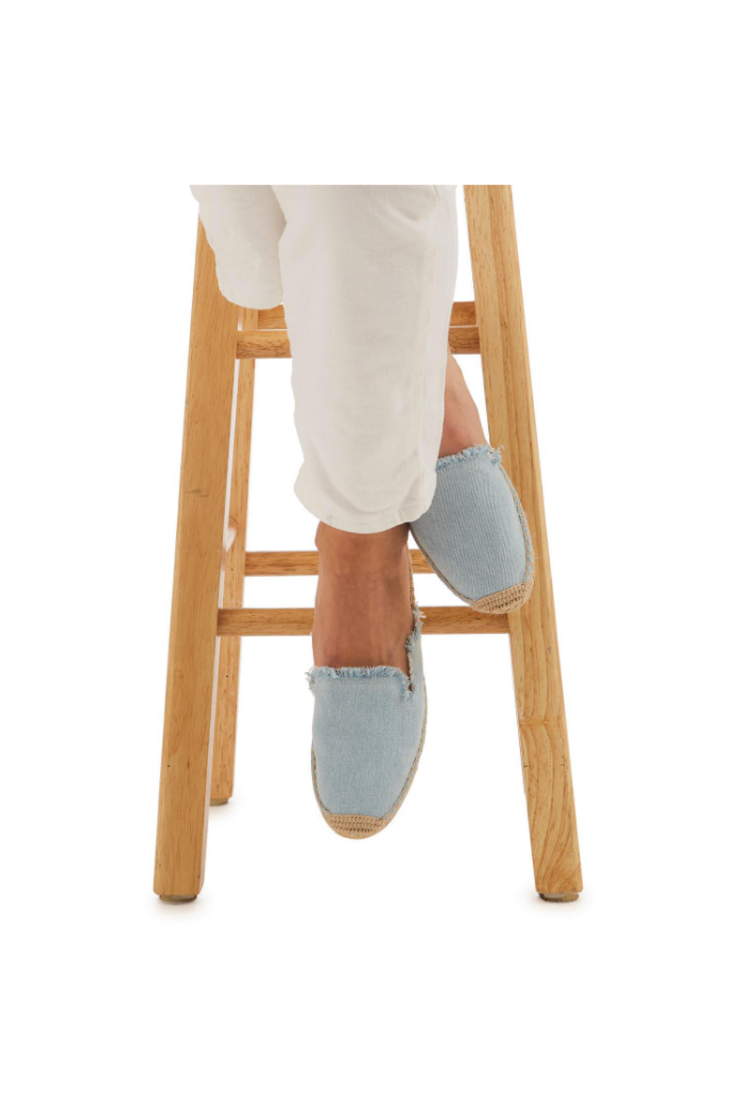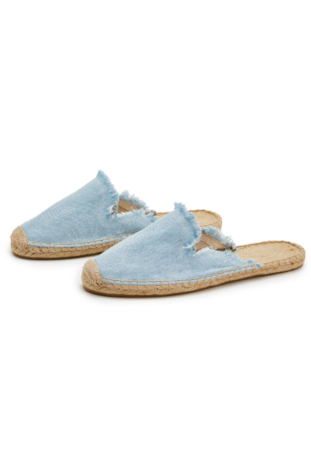 These easy to wear, slip on design espadrille slides in cotton denim with frayed edge are perfect to wear with just about anything