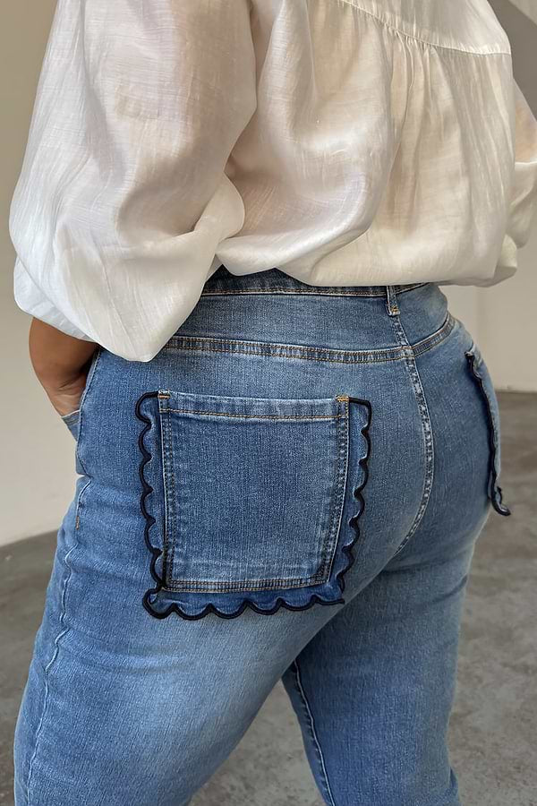 Our iconic scallop jeans, with scalloped pockets and our embroidered logo, in a flare silhouette. The most flattering jean which are reminiscent of the 70's, designed with a close fit on the legs that widens into the perfect flare at the cuffs. Showcase the pocket detail with a tucked in tee/shirt or to keep the 70's vibe going add our Elinor blouse.