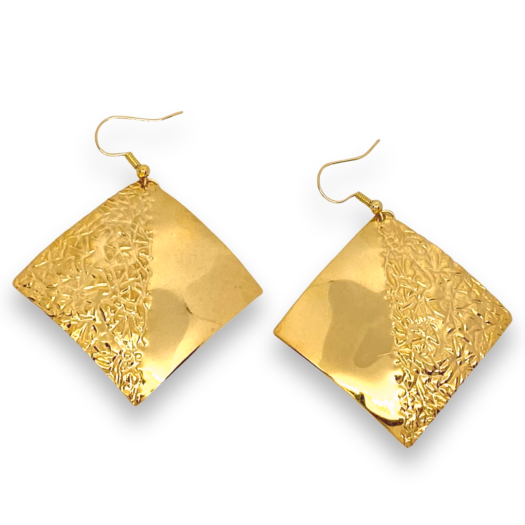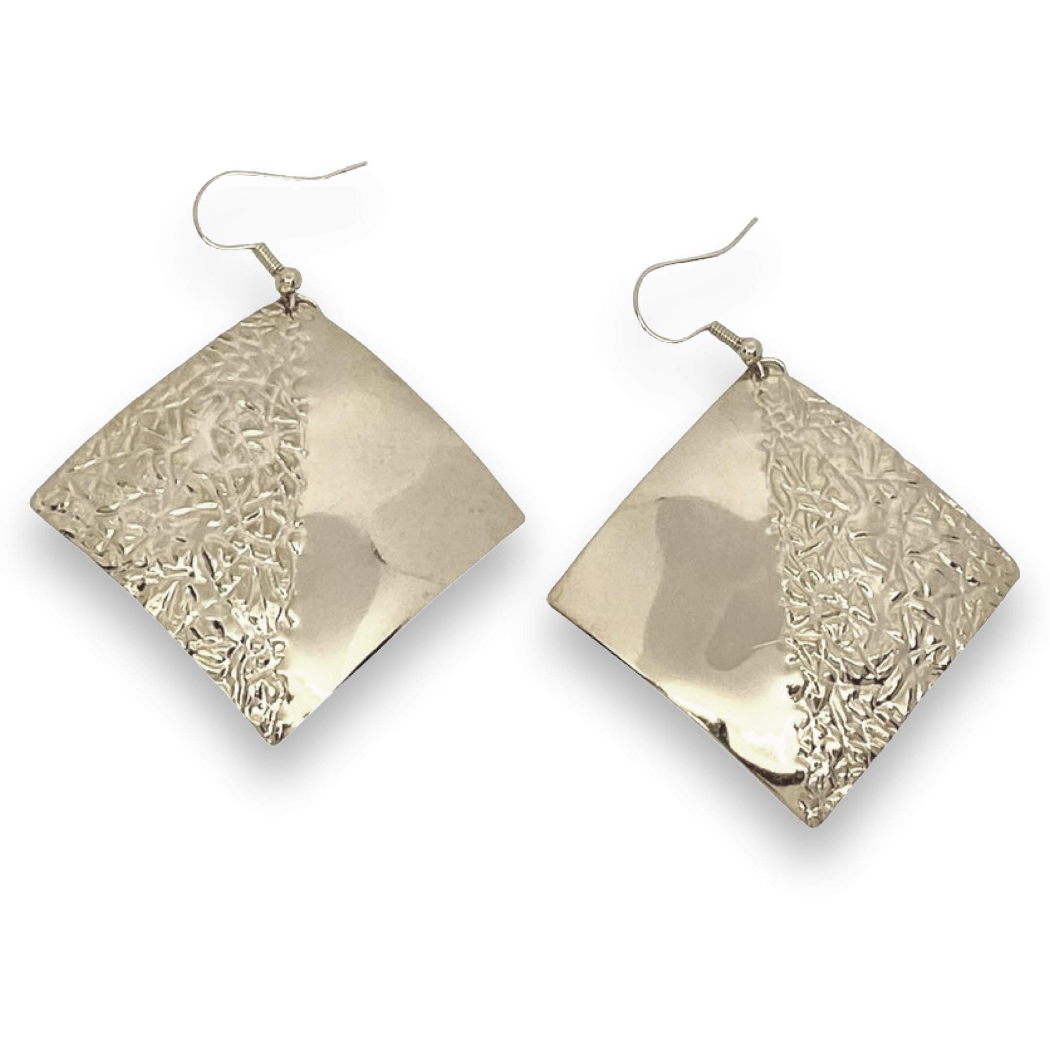 Diamond Dome Earrings featuring textured metal and a shiny shimmering diamond shaped dangle. Great for any occasion or getaway.