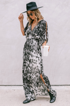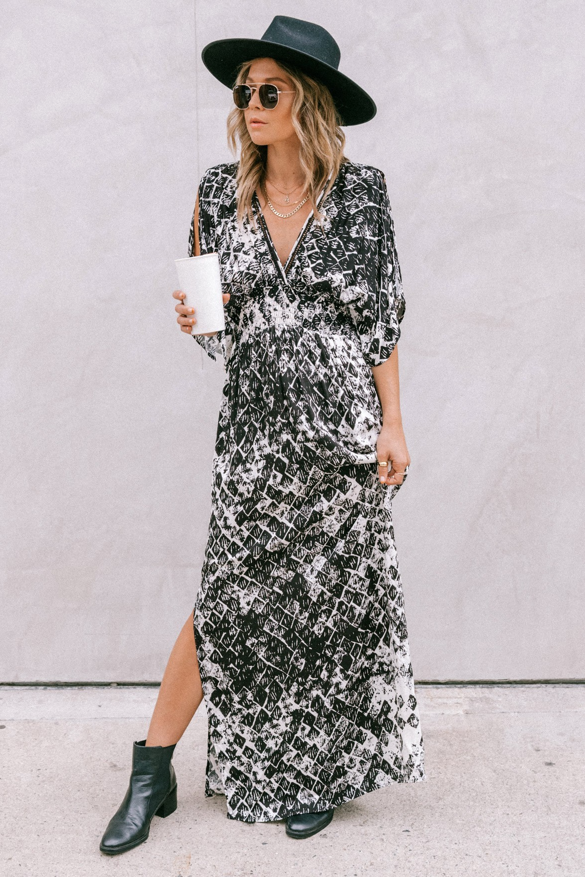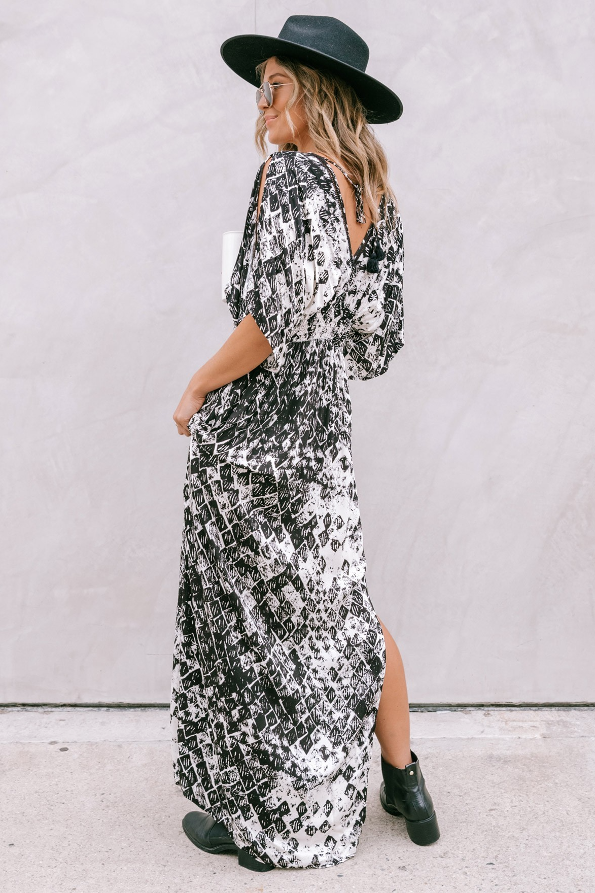 Diamond Kimono Sleeve Maxi Dress. A simple and elegant plunge v-neckline kimono split-sleeve maxi dress in a diamond print. Featuring a smocked waistband, side slits, and a sexy open back,. A great beach cover-up.