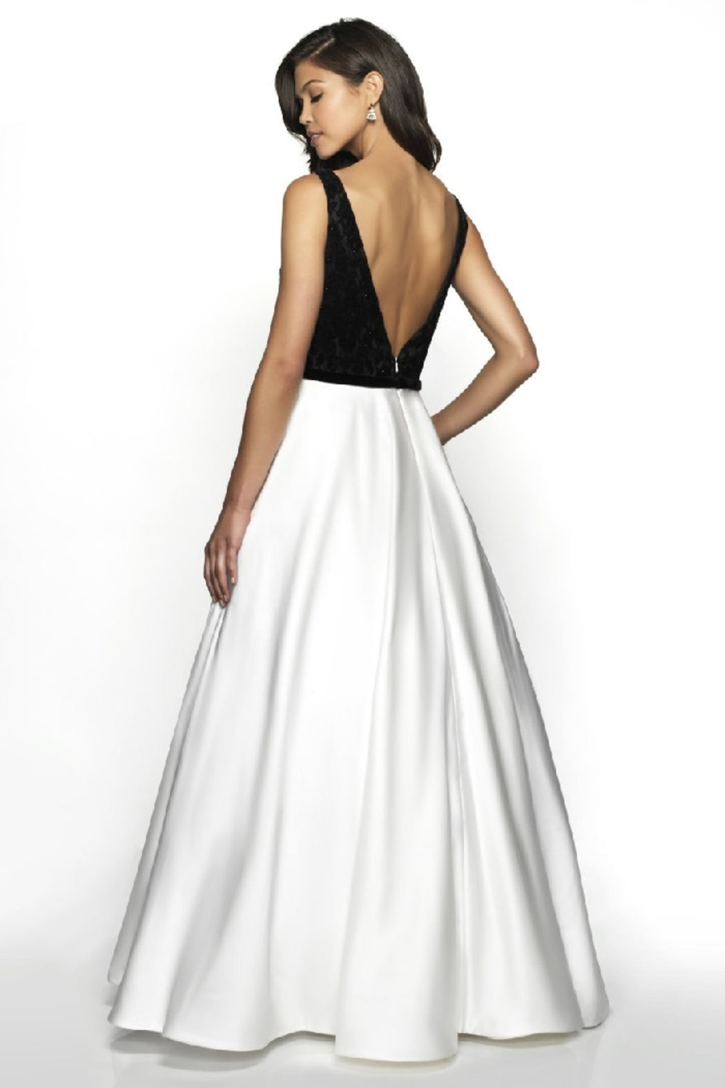 Two toned bridal ballgown with lace top, velvet bow belt and deep v backline.