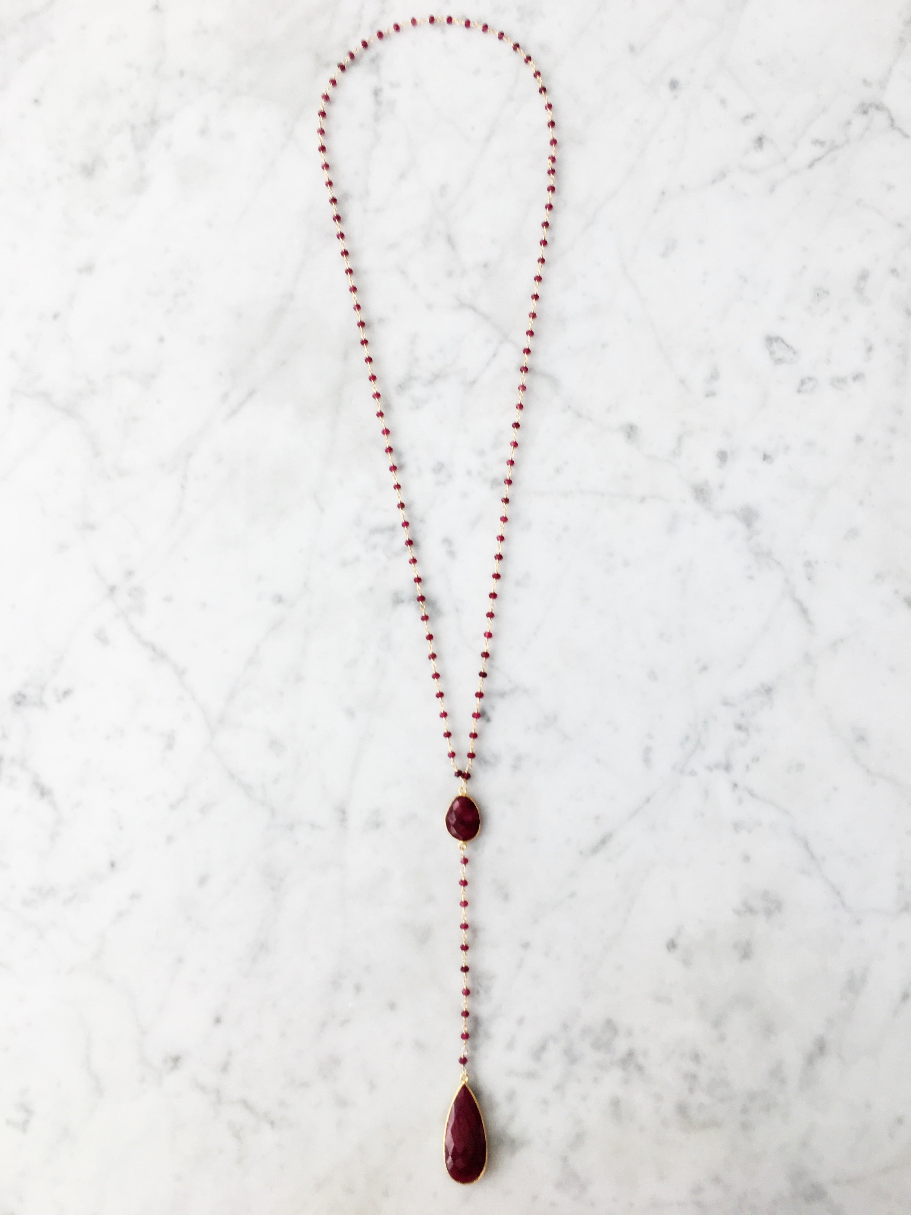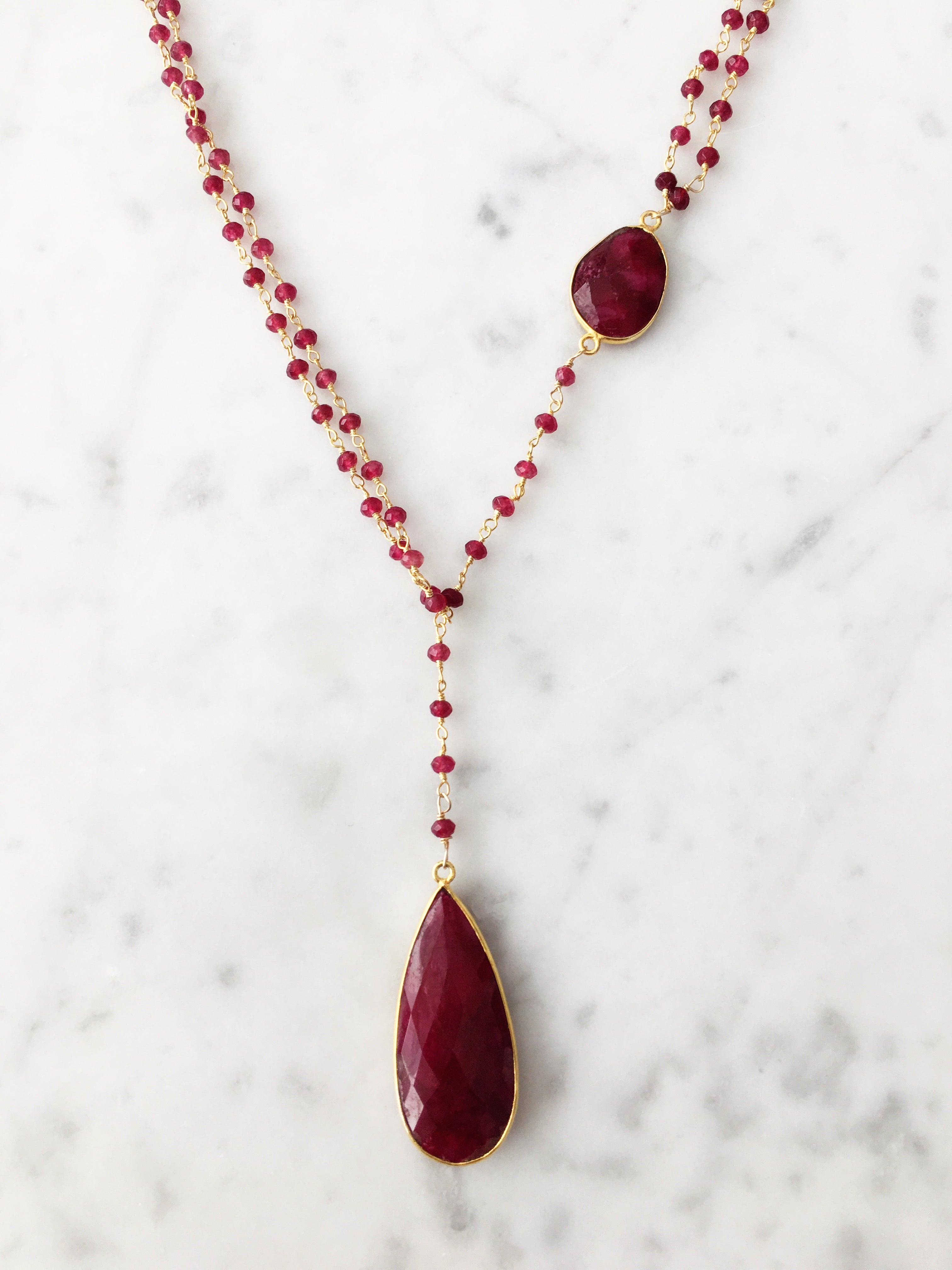 A gold and semi-precious ruby beaded chain necklace with a round semi-precious ruby stone set in an 18k gold vermeil bezel, cascading down to a teardrop-shaped semi-precious ruby stone pendant set in an 18k gold vermeil bezel.