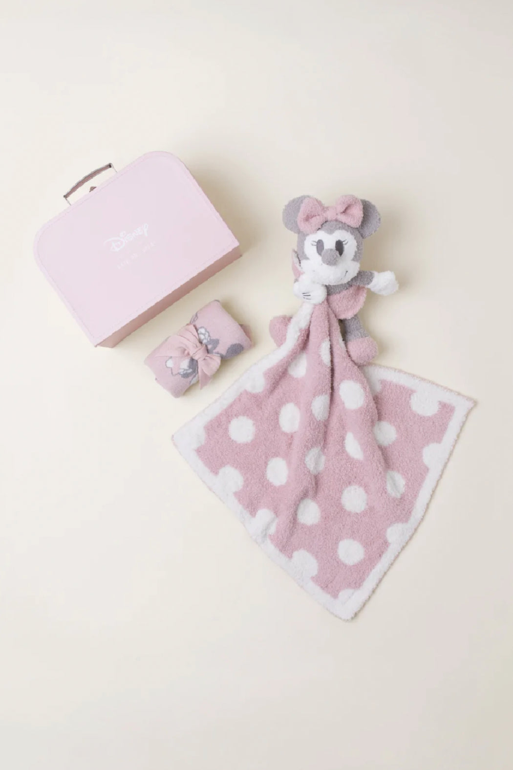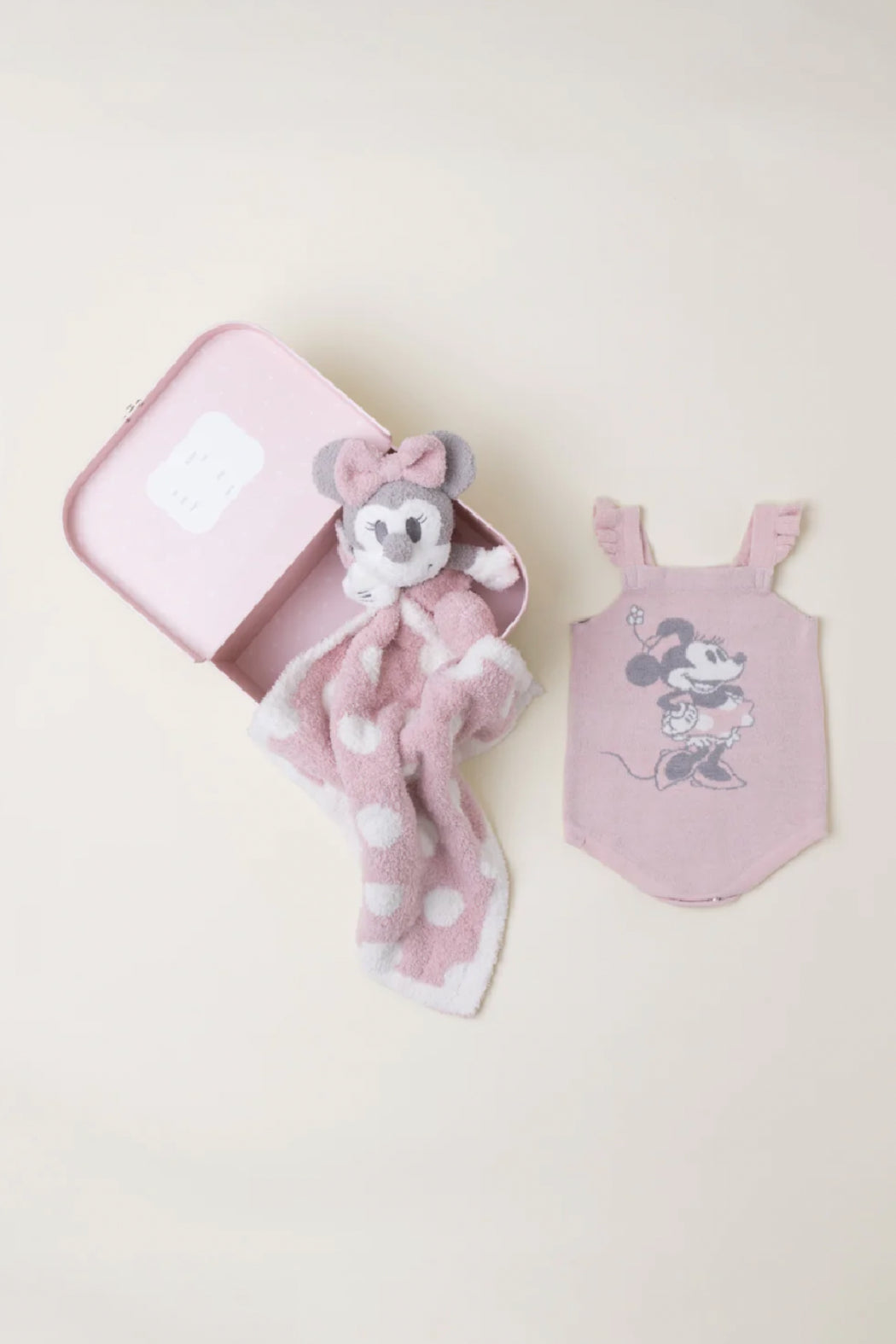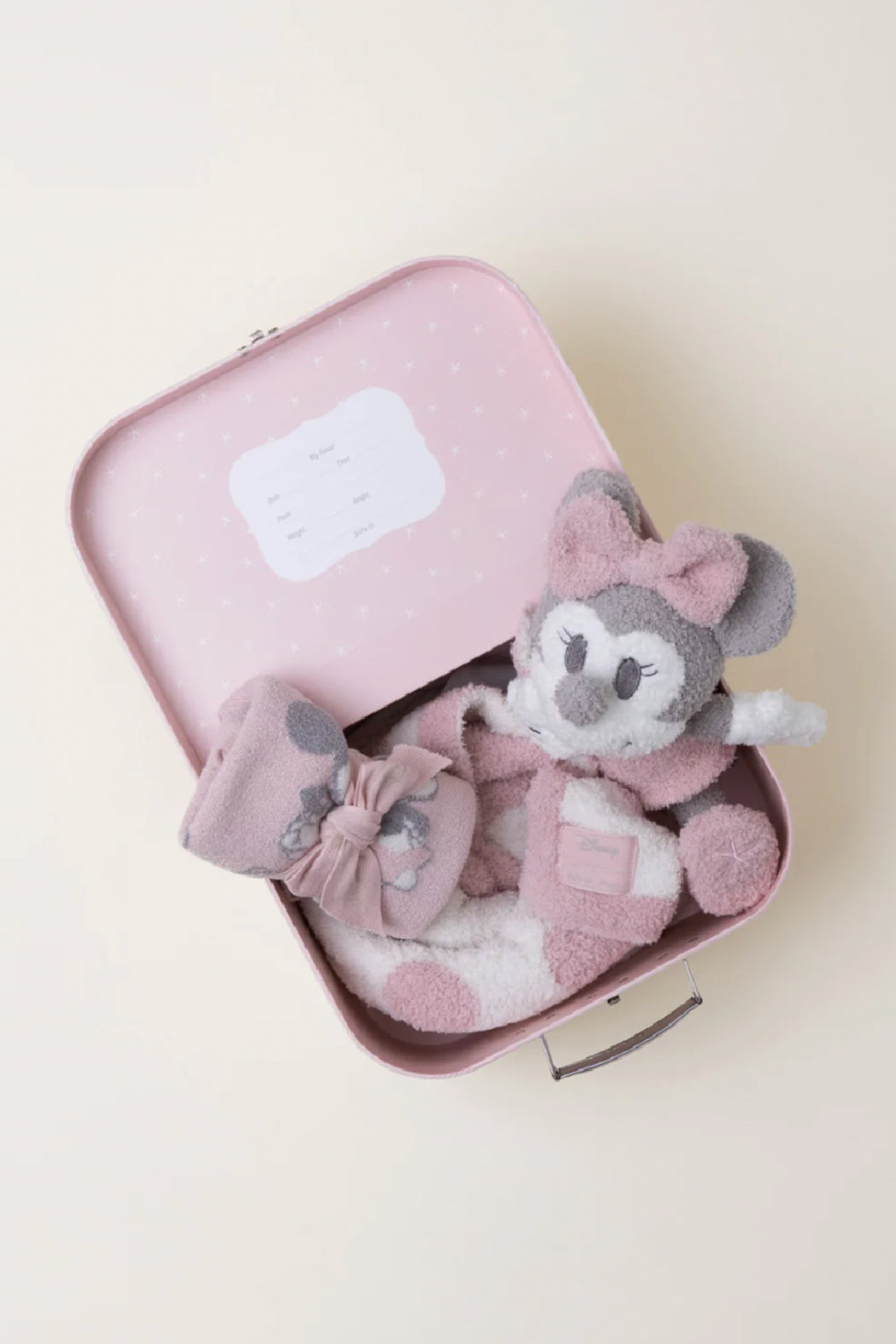 Snuggle up with fan favorite Disney Minnie Mouse™ in this adorable gift set. Set includes a CozyChic Ultra Lite tank top onesise with adjustable ruffle straps secured with back button, snap closures at bottom, Minnie jaquard design, and a CozyChic Minnie buddie holding on to a signature polka dot blankie. Packaged inside a special luggage box with metal clasp and handle that doubles as a keepsake that details important info: name, date, time, place, height, weight, and born to.