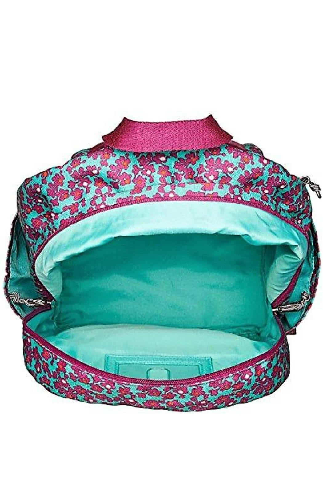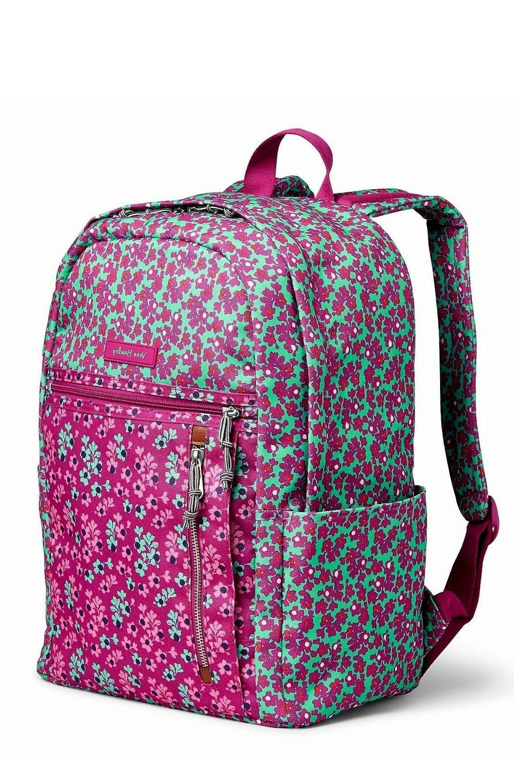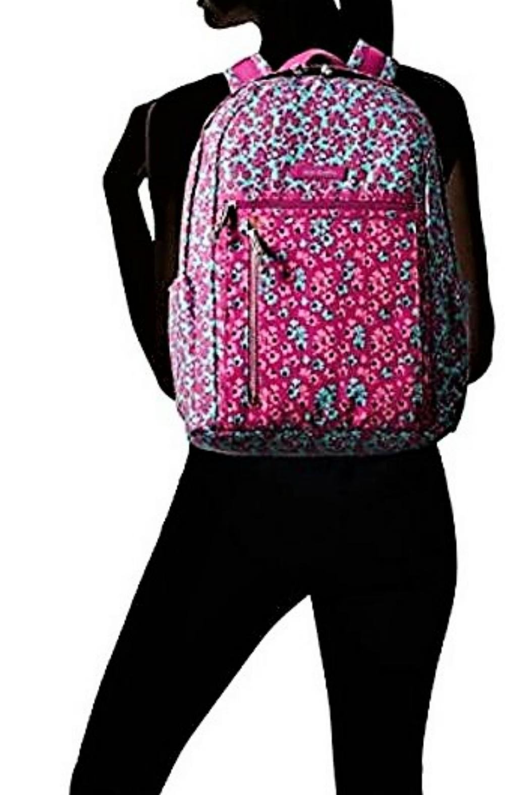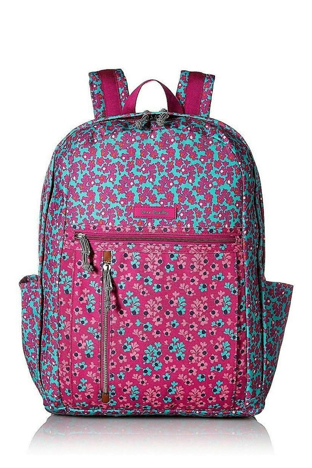 This is the Vera Bradley Lighten Up Small Backpack in the Ditsy Dot pattern. Whether you need it for school, an overnight stay, or a quick weekend trip, this backpack is your adventure companion. The Lighten Up fabric is water repellent, so no worries about your belongings getting soggy. Built to last, it is also machine washable and fade resistant. It features 2 front zip pockets (one with a charger pocket), 2 side slip pockets, a back zip pocket, and a large main compartment with a full size padded slip pocket and an ID window. Click "Mimi's Gift Gallery" on this page to find many other backpacks, bags and accessories from Vera Bradley. Dimensions: 11.25 wide x 15 high x 7 inches deep with 3 inch top handle drop and 31 inch adjustable padded shoulder straps.