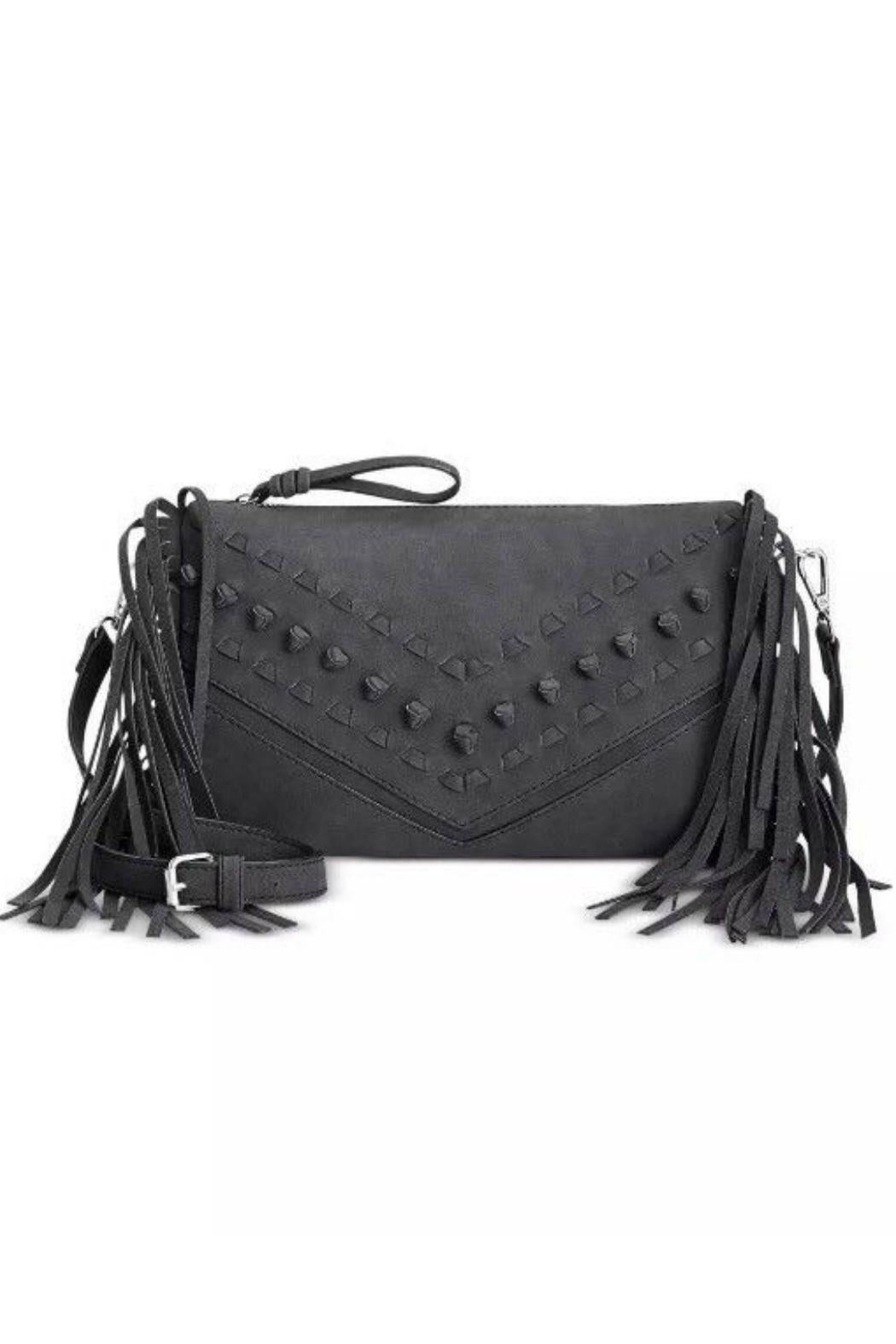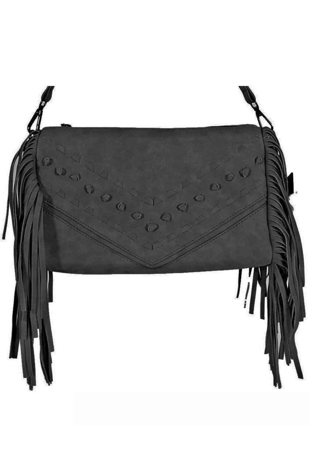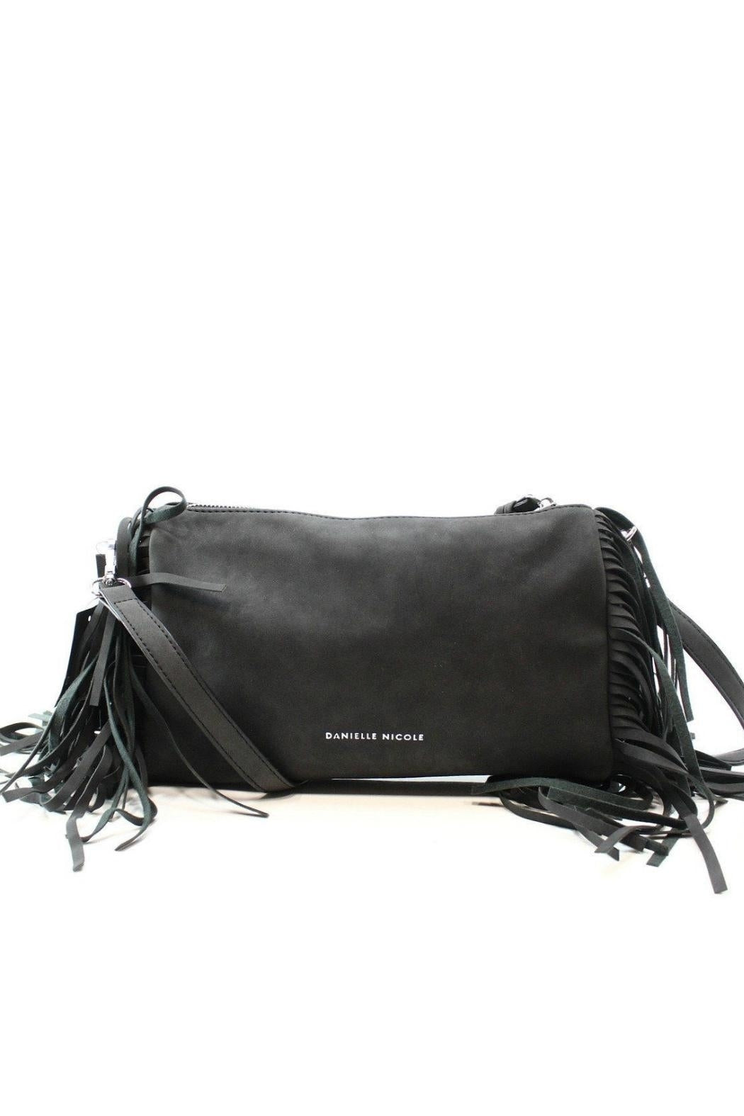 Here is the Danielle Nicole Cara Crossbody in Charcoal Black Suedecloth. Extremely light weight, it's the perfect solution if you like to carry plenty of girly gear, but still remain hands free. Lots of fringe on both ends of the bag, and woven stitched detail on the front. Back has Danielle Nicole branded in. Top zipper with nice long zipper pull. Inside is a zip pocket, two slip pockets, and signature poly satin lining. Click on "Mimi's Gift Gallery" on this page to find other Danielle Nicole bags. Dimensions: 12" long x 7" tall x 3.5" deep. with 20-24" adjustable crossbody/shoulder strap