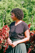 Our Dolman top is easy to wear, Cropped enough to be able to tuck in with out the extra bulk, or wear as is without showing too much midriff. Joined together at center front & neckline with bias binding. Dolman sleeves for the perfect arm coverage. A loose yet structured look for the modern woman.