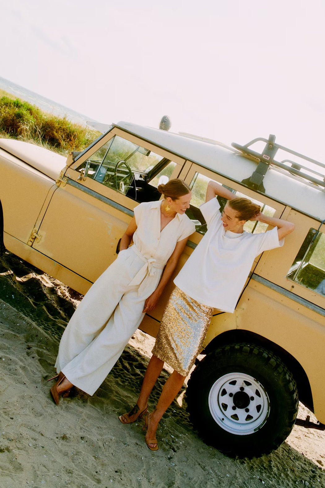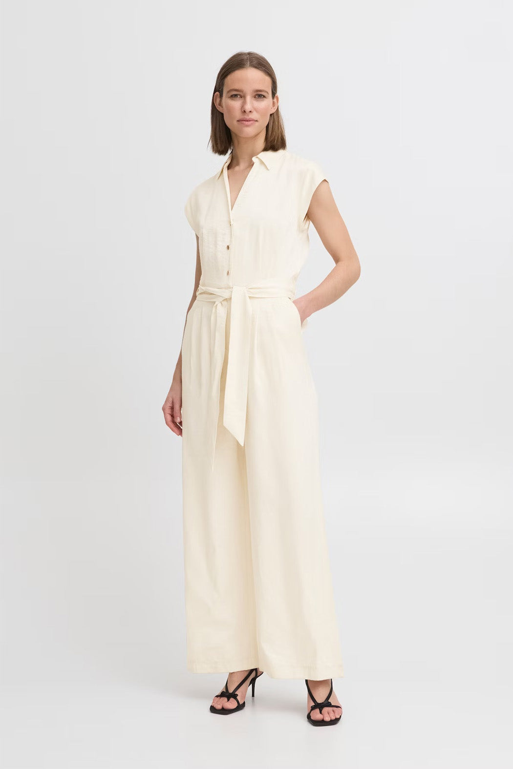 Step into your next event or party with in style in the Donni Jumpsuit. In an off white with subtle gold shimmer, this sleeveless jumpsuit belts at the waist for a flattering fit and features a v-neckline with collar and gold button up front. Ideal for a taller woman or a person who struggles to find a jumpsuit that will fit their longer torso.