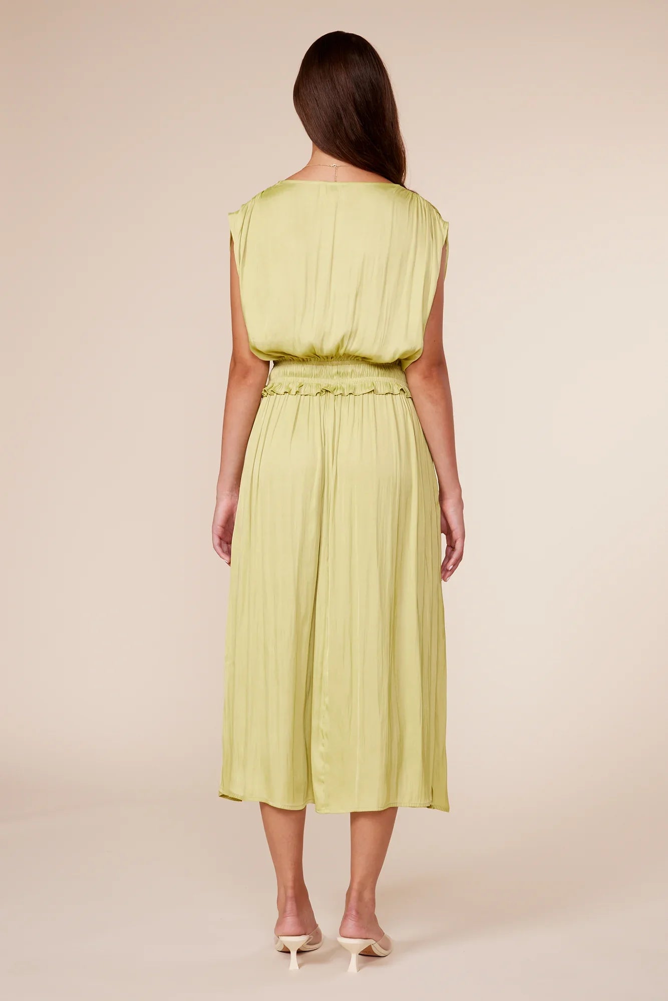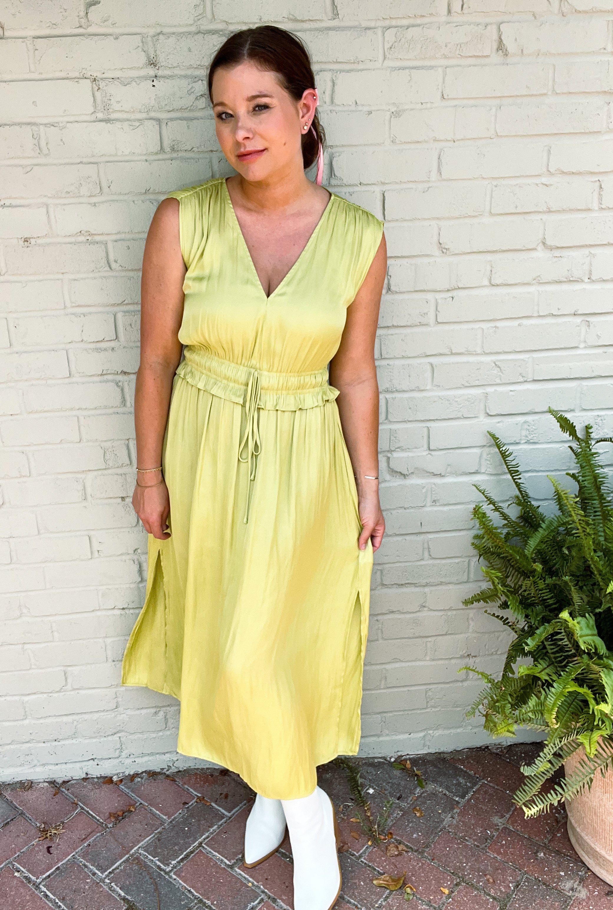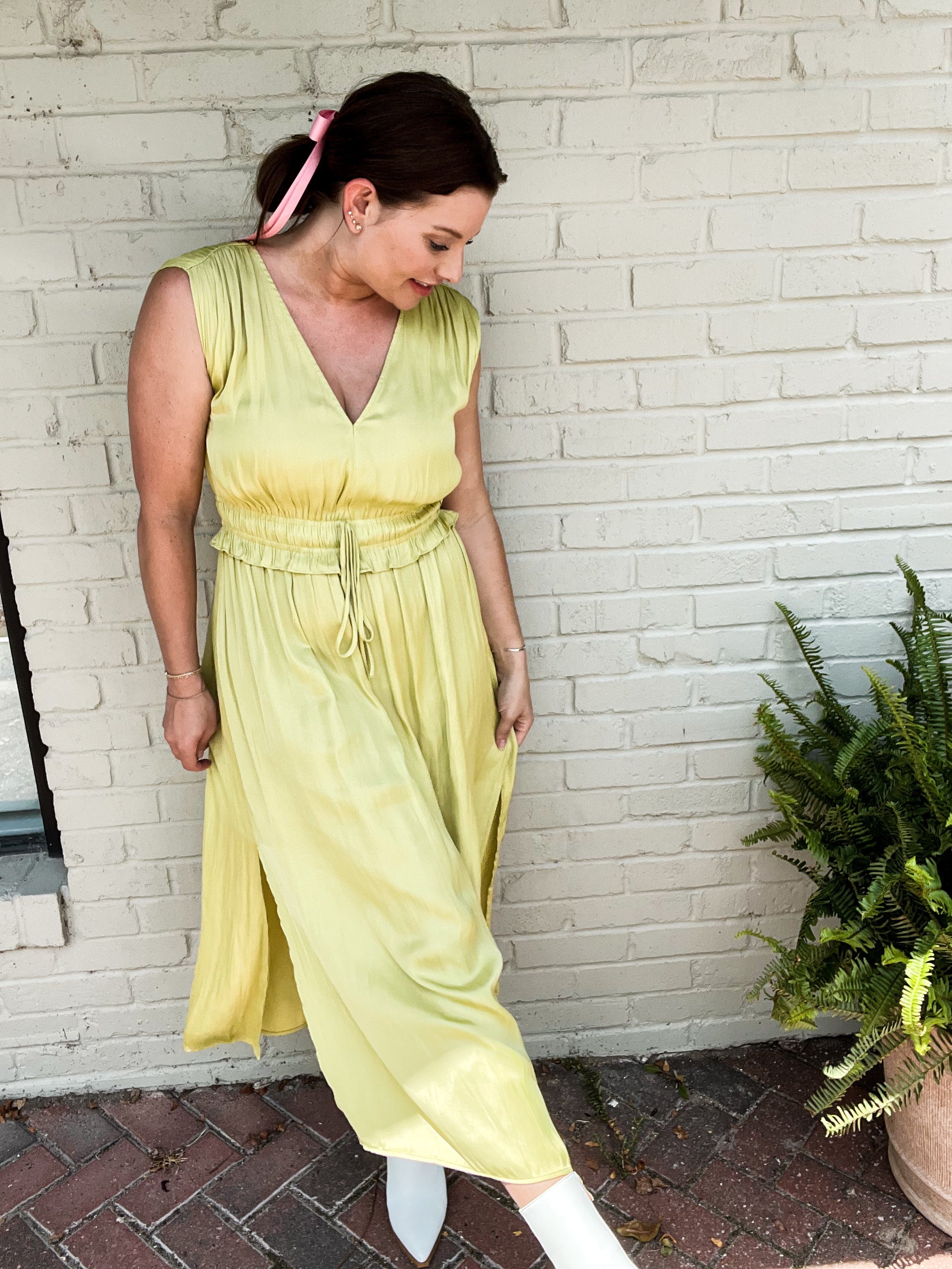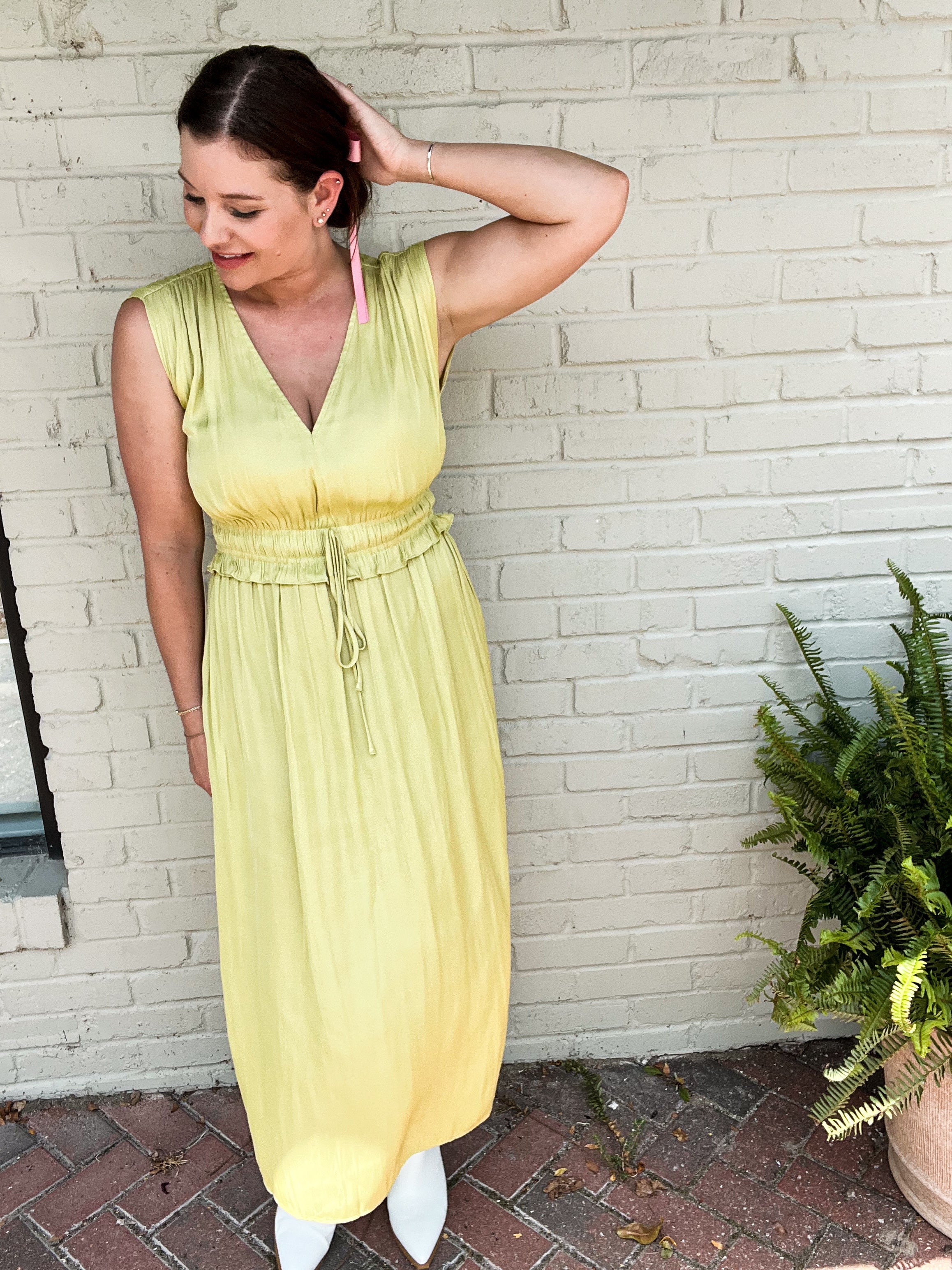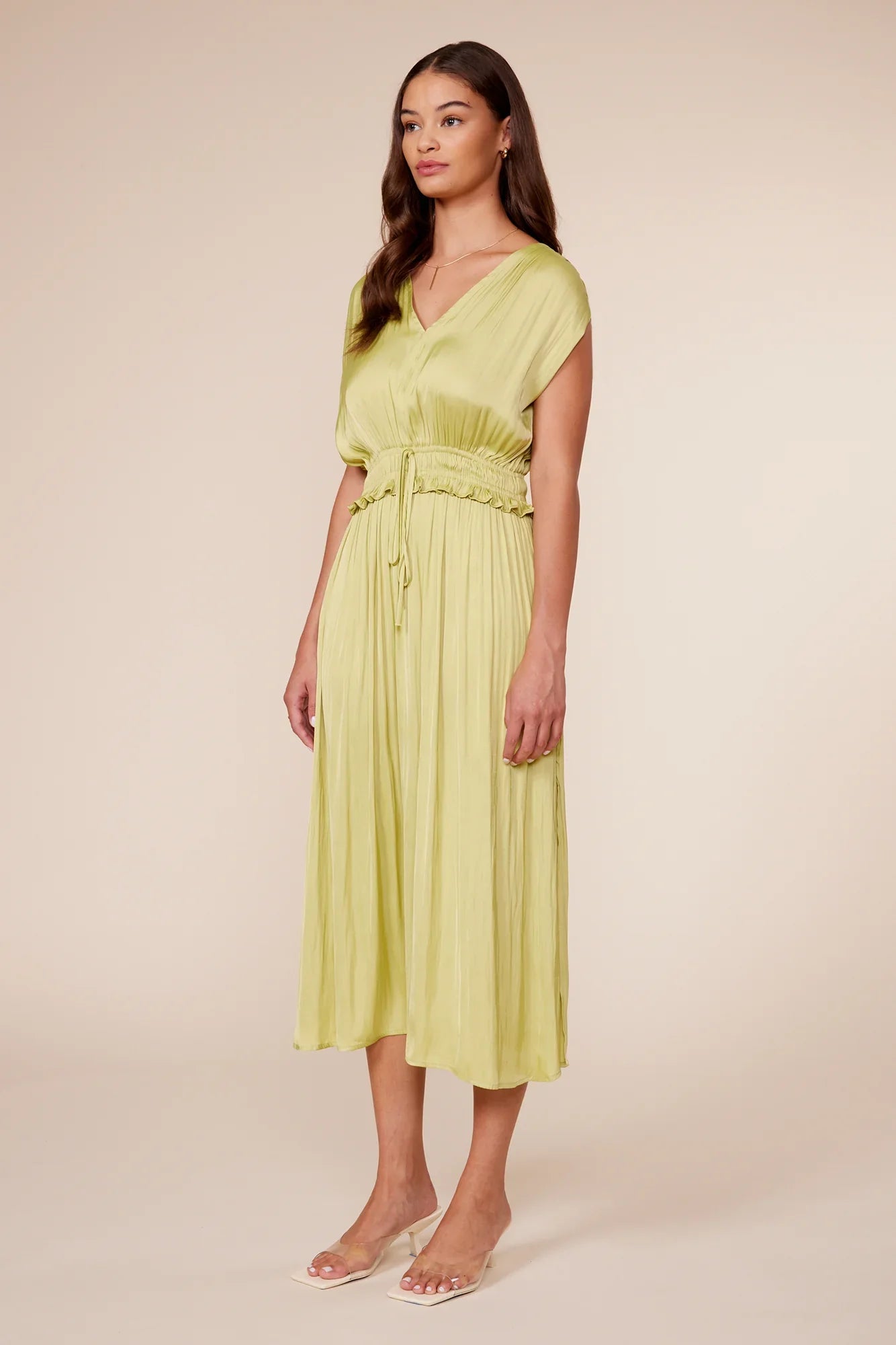 Get ready to turn heads in the Dorian Satin Dress! This stunning piece features loose pleats and a waist tie for a flattering fit. The V-neckline adds a touch of elegance. In a lovely light green shade, this dress will make you stand out in any crowd.