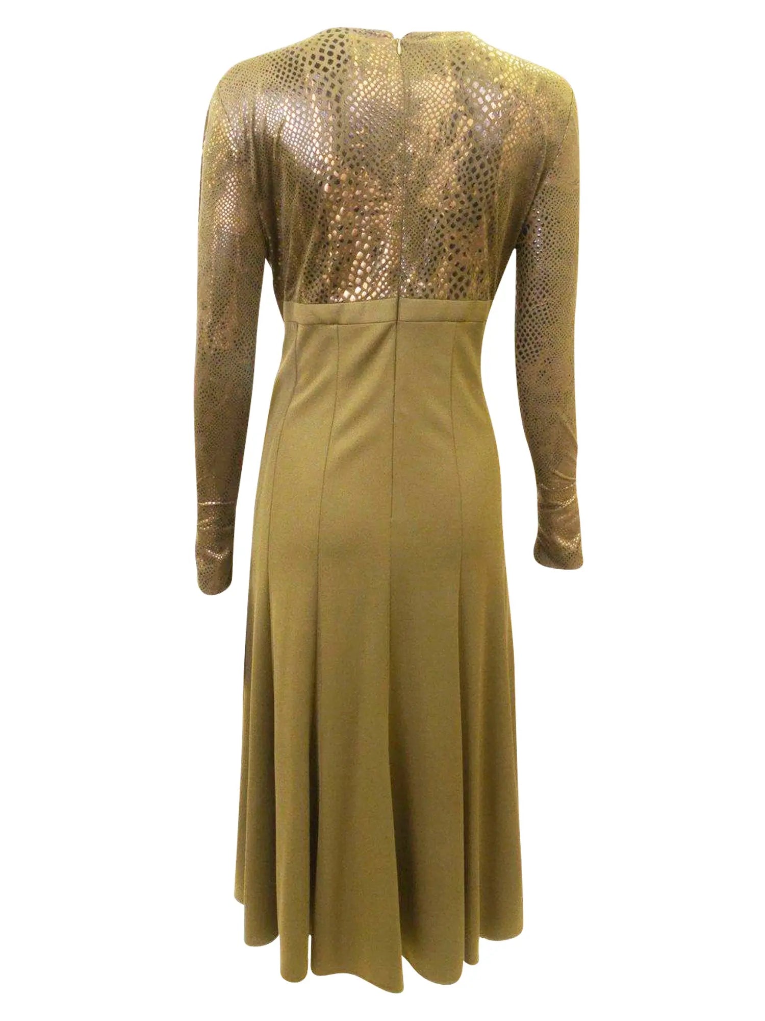 Olive colored snakeskin printed a-line shift dress, green and white diamond studded brooch on top right, pleated neckline, midway back zipper, long sleeves. Dry Clean Only