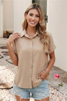 The Dotted Cuff Sleeve Shirt is a lightweight, button-front shirt with a classic shirt collar and cuffed short sleeves. 66Disco designed this breezy blouse in a soft dotted print with a relaxed silhouette that pairs easily with denim or tailored pants. Its polished collar and subtle pattern make it perfect for casual weekends or dressed-up work looks.