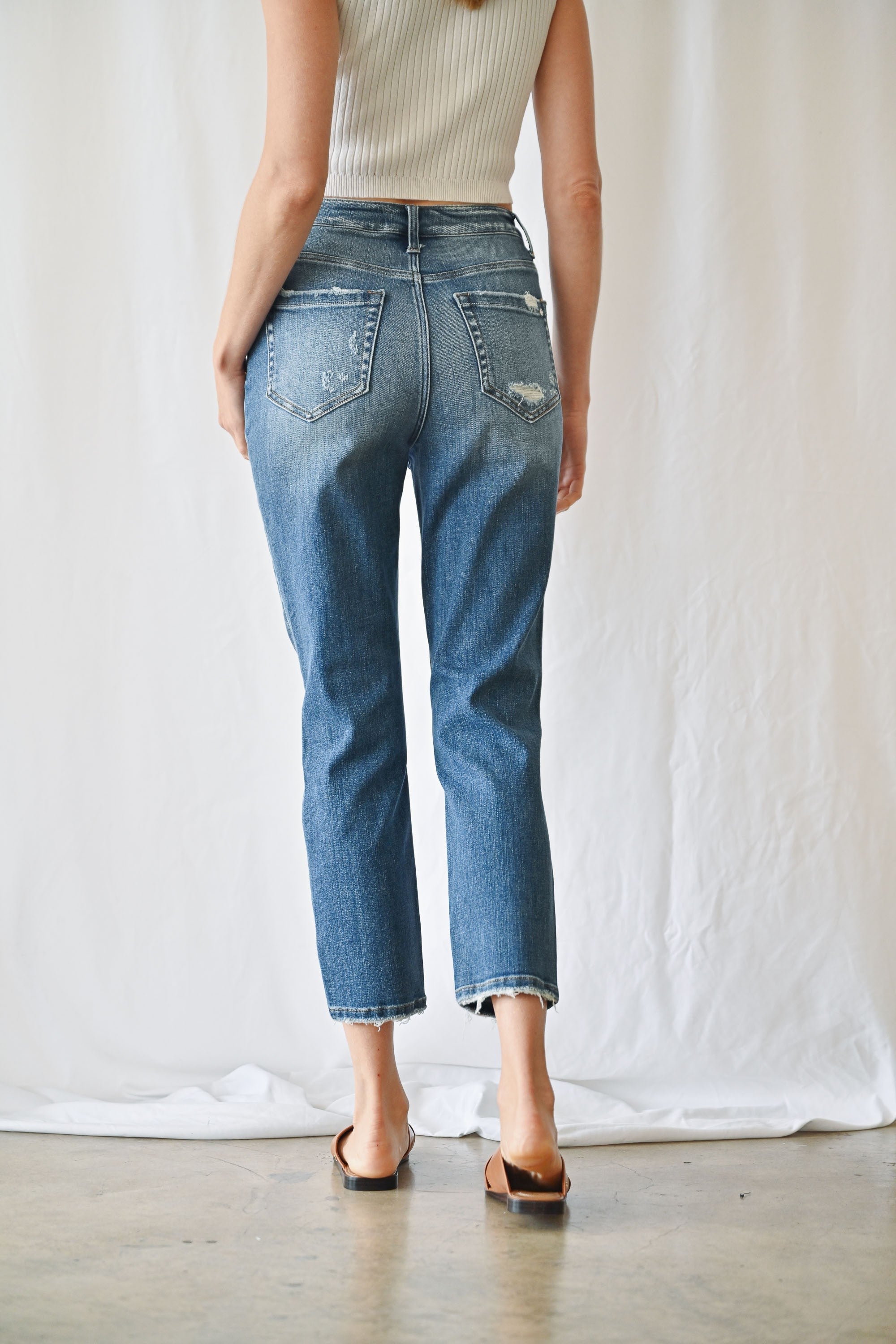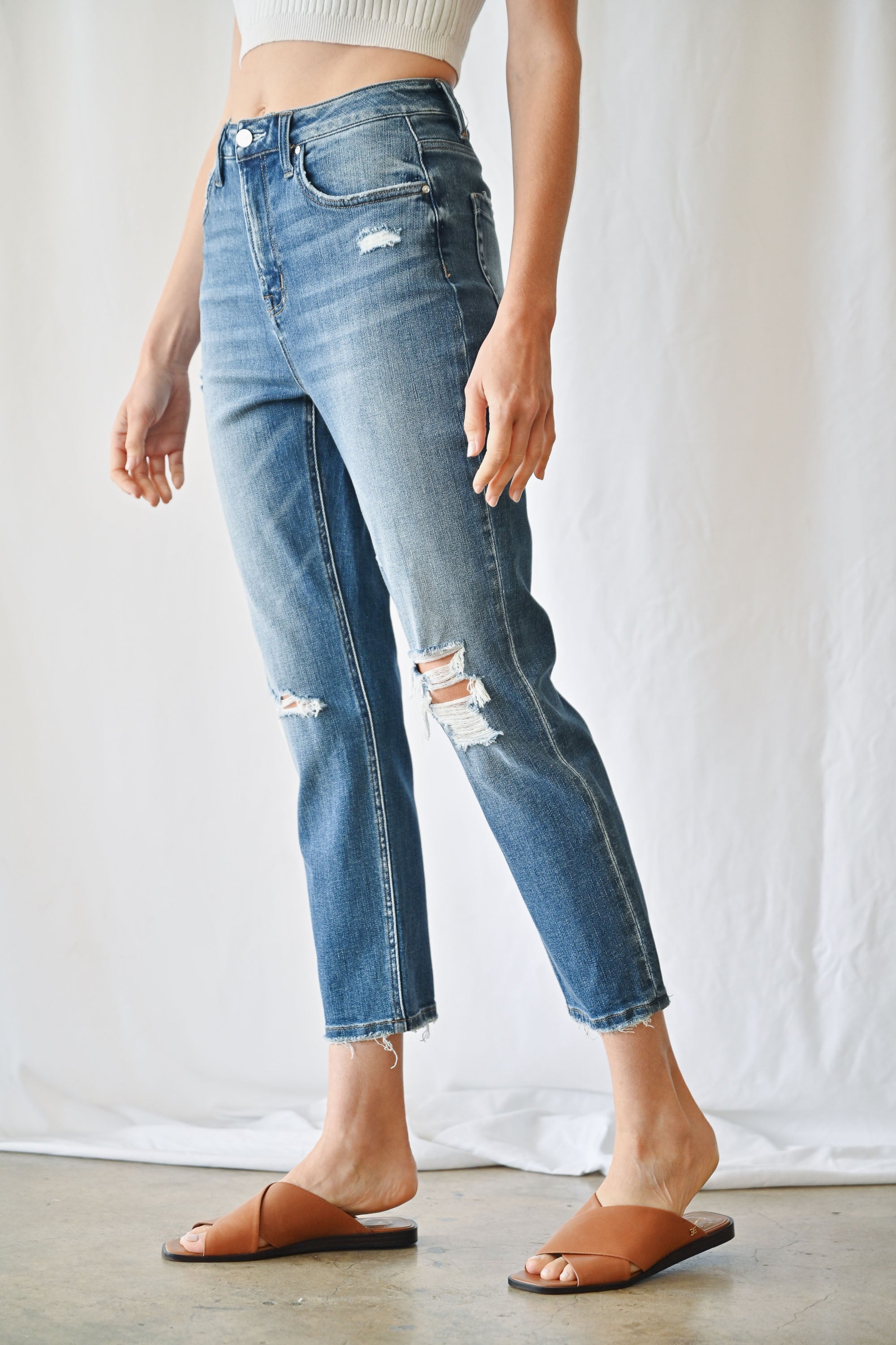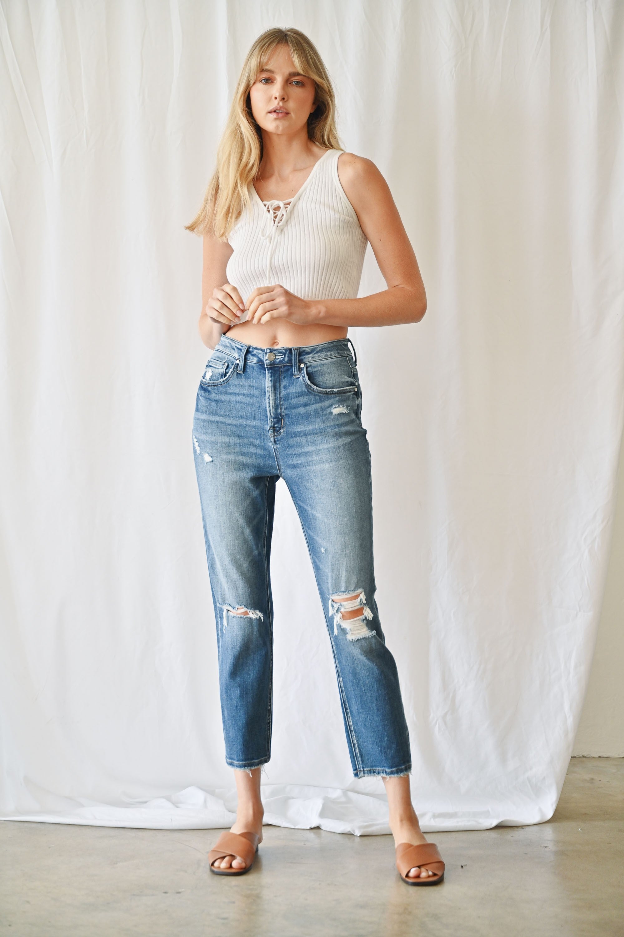 This Double Dare Distressed Relaxed Fit Denim features a high quality blend of 92% cotton, 6% polyester, and 2% spandex, providing superior comfort and durability. The classic front rise measures at 11 inches, providing a flattering and secure fit.