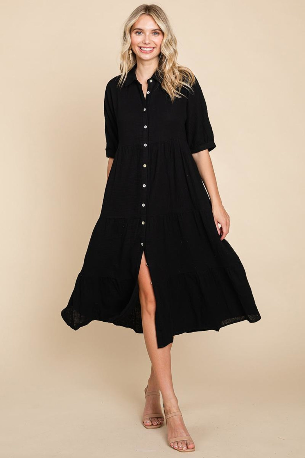 Features: Collared, Short Sleeve, 3 Layered, Midi Length, 2 Side Pockets, Button Up Shirt Dress, Ruffle Hem, Soft Double Gauze Fabric