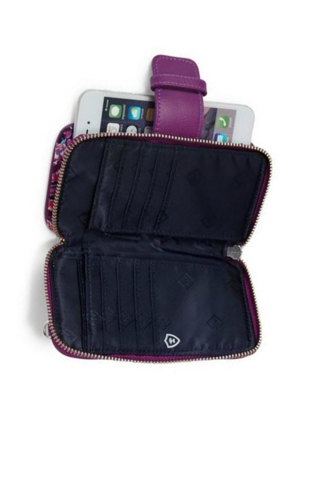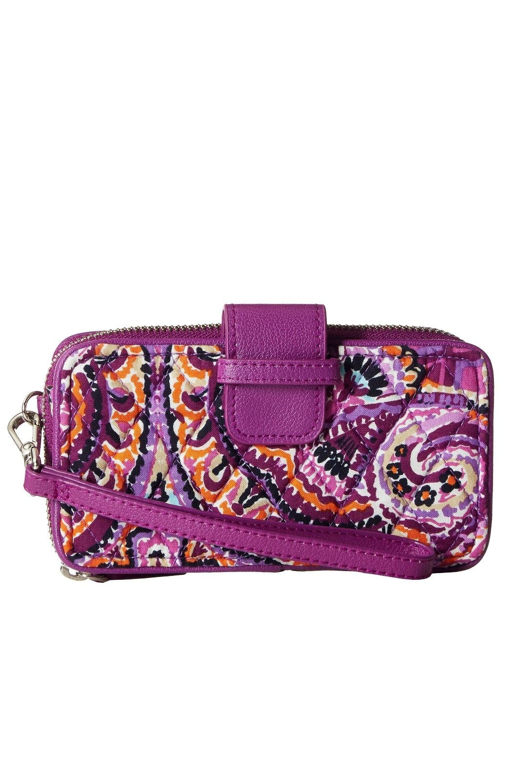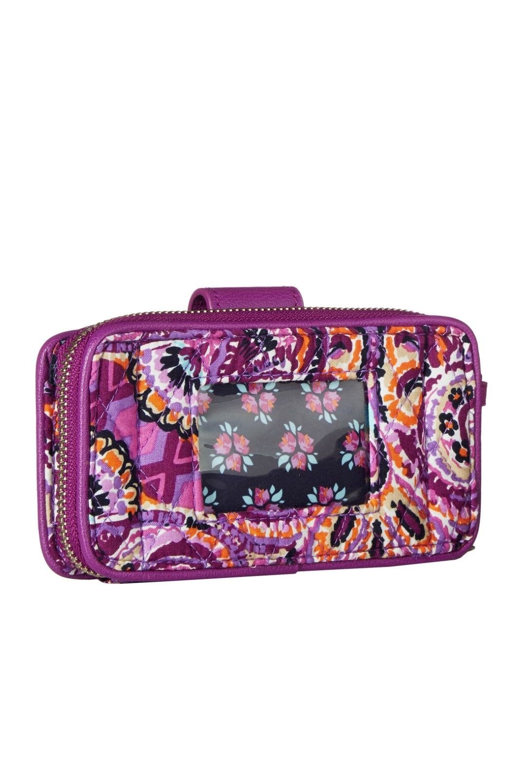 Here is the Vera Bradley RFID Smartphone Wristlet in the Dream Tapestry pattern. Give your look a dash of chic with this fun wristlet. Made of quilted cotton with vegan leather trim and a poly satin signature lining. RFID protection for all your credit and debit cards. Zipper closure. Detachable wristlet strap. Exterior back ID window. Slip phone pocket fits up to 6" cell phone has pin snap closure. Eight interior credit card slots, zip coin pocket, slip pocket, and a bill pocket with zip closure. Silver tone hardware. Pattern placement will vary. Click on "Mimi's Gift Gallery" to find other bags and accessories in the Dream Tapestry and Dream Diamonds patterns. Dimensions: 6.25" wide x 3.25" high x 1.5" deep with a 7" wrist strap.