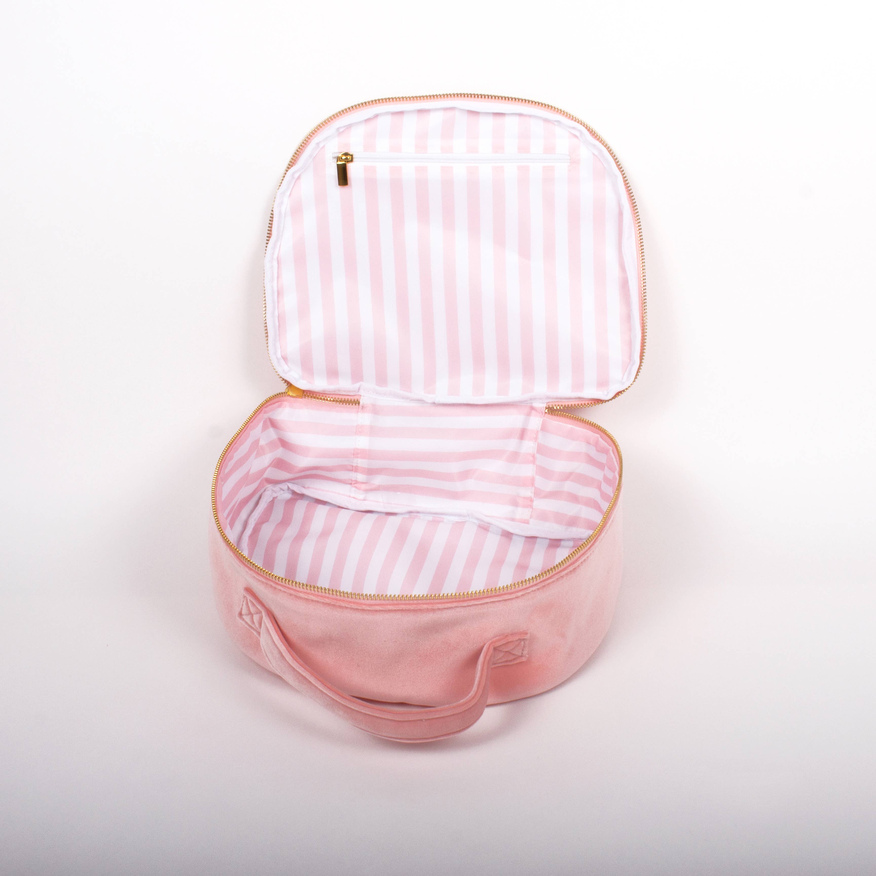 Have a business trip coming up? Or maybe you’re planning your next summer getaway to a tropical paradise? Either way, our Dusty Pink Velvet Train Case is the perfect companion for your wanderlust-inspired trips. With easy zip closure and top handle, gold metal hardware detailing, plus a wipe-clean interior, this train case is designed with elegance in mind. Offers pletny of space for storing all the essential items: your toiletries, makeup kit, valuable jewelry pieces – whatever it is that we need to make sure they are safe throughout the journey.