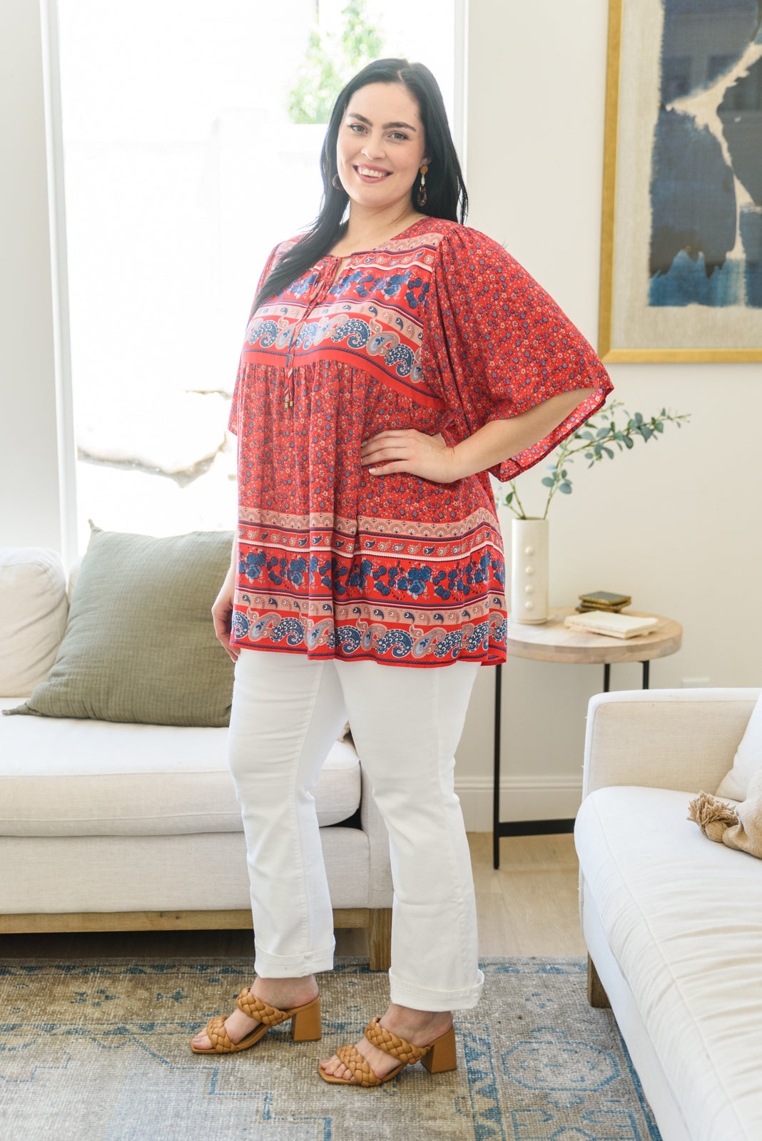 The Easy Street Top is so amazing it gives us butterflies! We are swooning over the bell sleeves, notched neckline with tie detail, babydoll silhouette, and the most amazing paisley and floral print! Pair with your favorite jeans and matching heels and let the top do the rest!