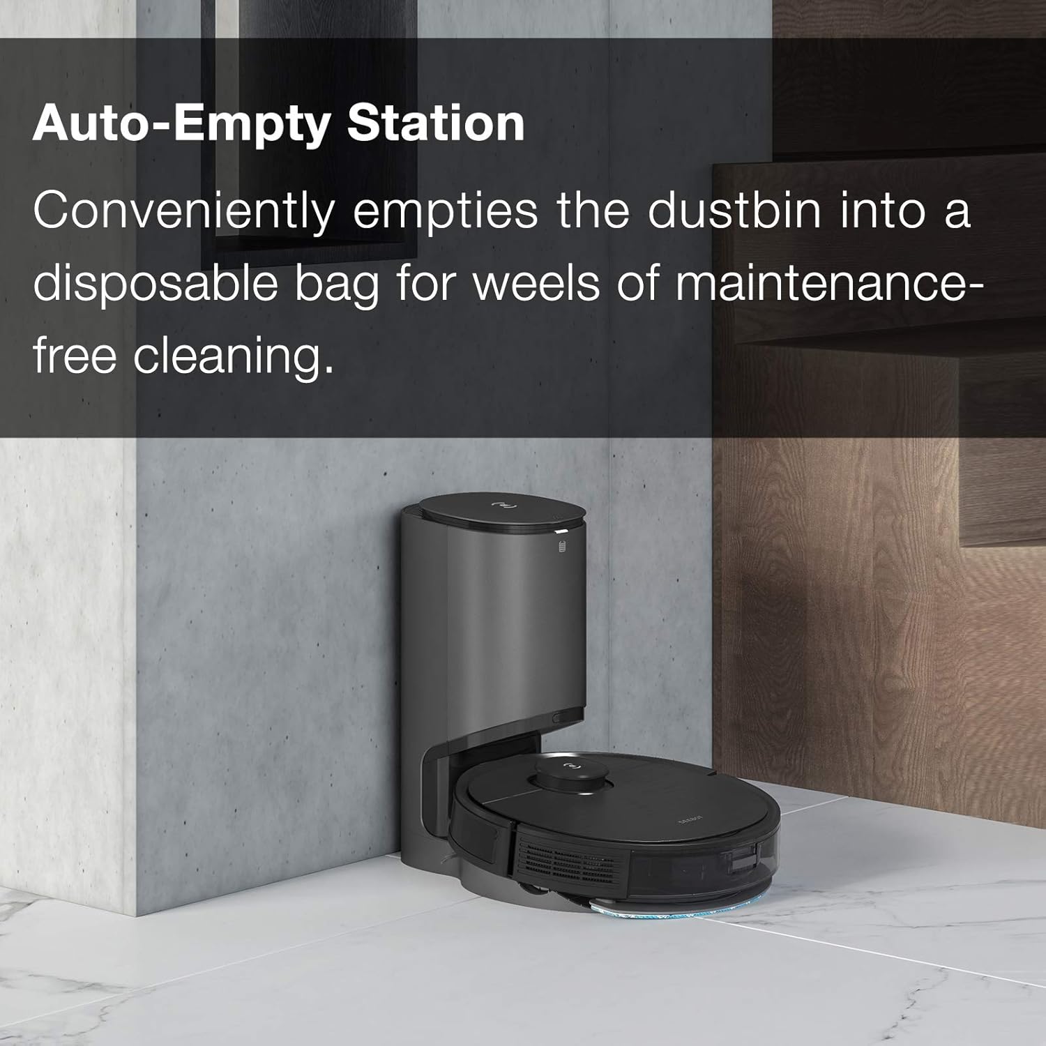 Auto-Empty Station: Conveniently empties your DEEBOT’s dustbin into a disposable bag for weeks of maintenance-free cleaning. Its large 2.5L capacity holds weeks of dust, debris, and pet hair.