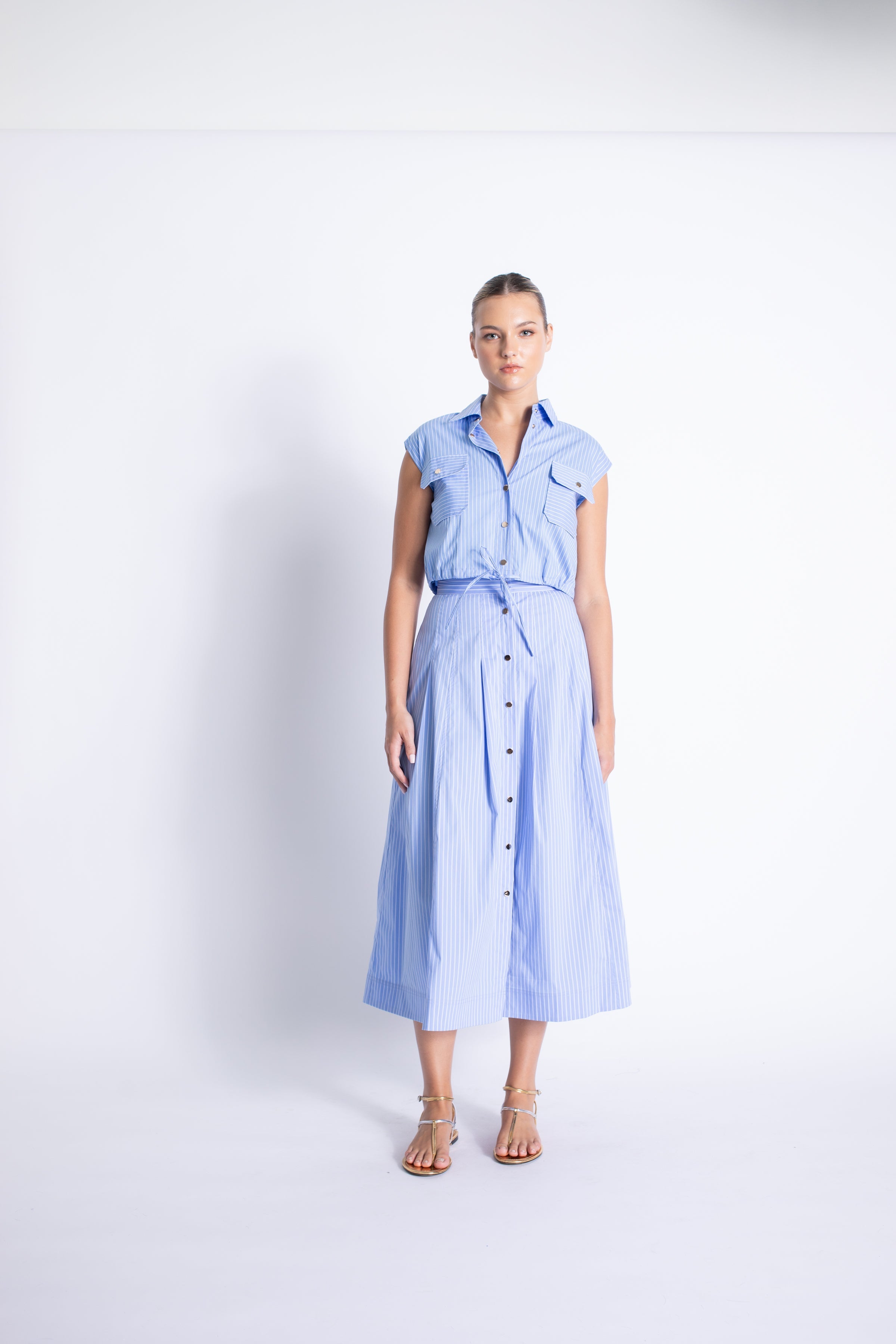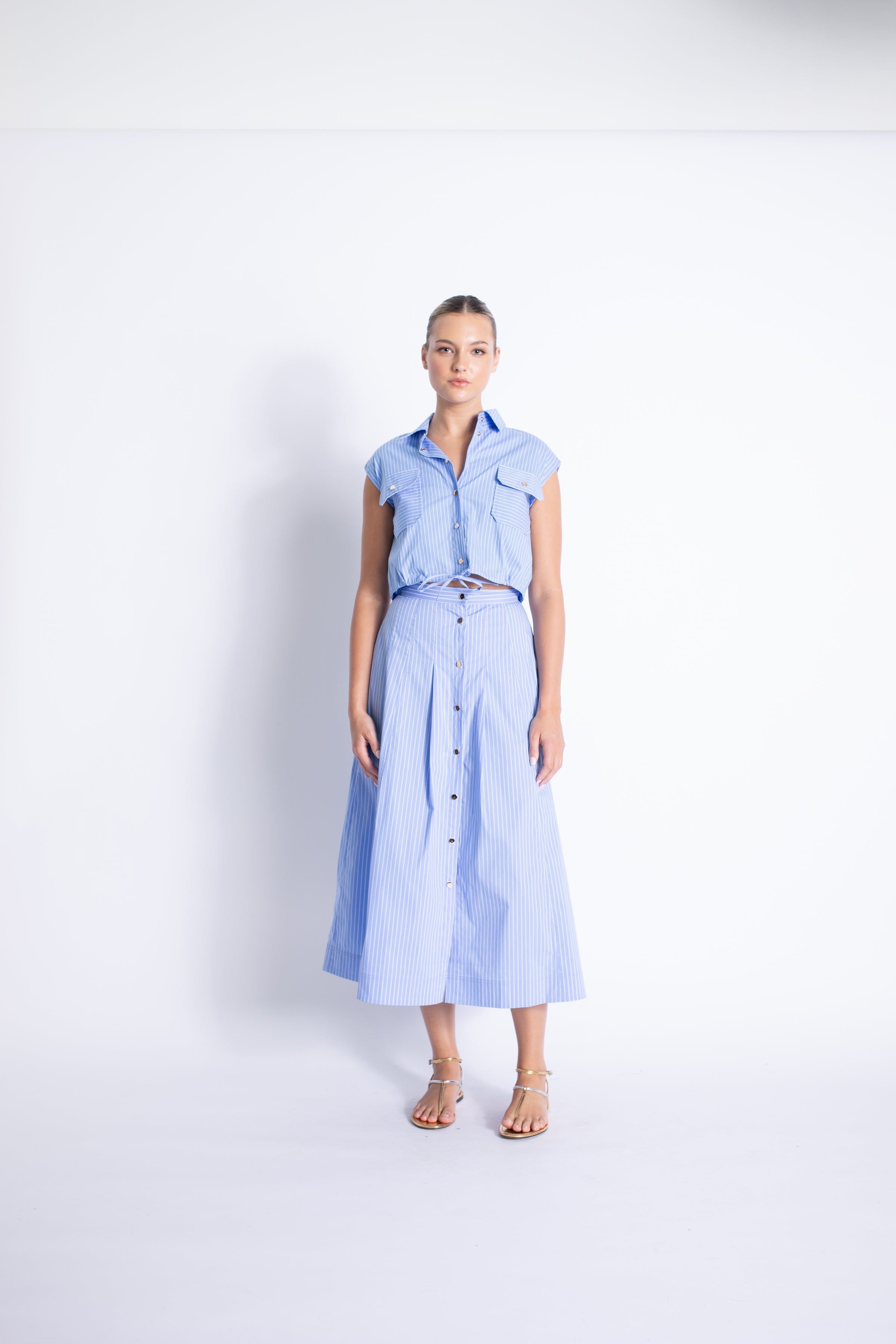 The Eden Top Blu Stripes features crisp, clean stripes and a waist tie for a stylish look. Pair with the Eden Button Down skirt or White jeans for a versatile and chic outfit. Made with high-quality materials, this top is a must-have for any fashion-forward wardrobe.