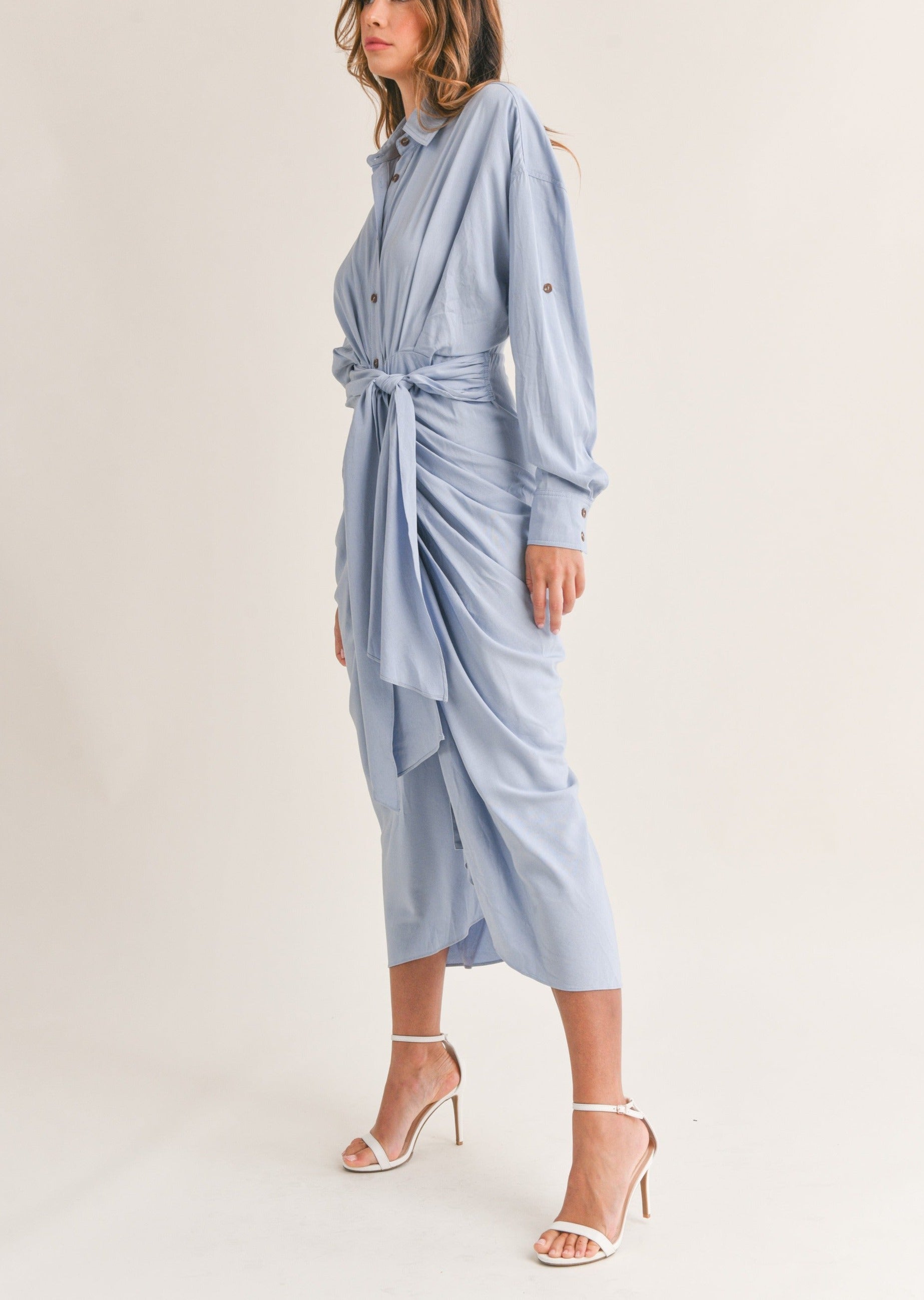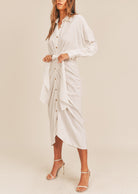 Look your most elegant in this sophisticated midi dress with luxurious Tencel satin! The front tie detailing and roll up sleeves with button tabs give it an extra chic look, while the comfortable fit makes it easy to wear all day and night long!