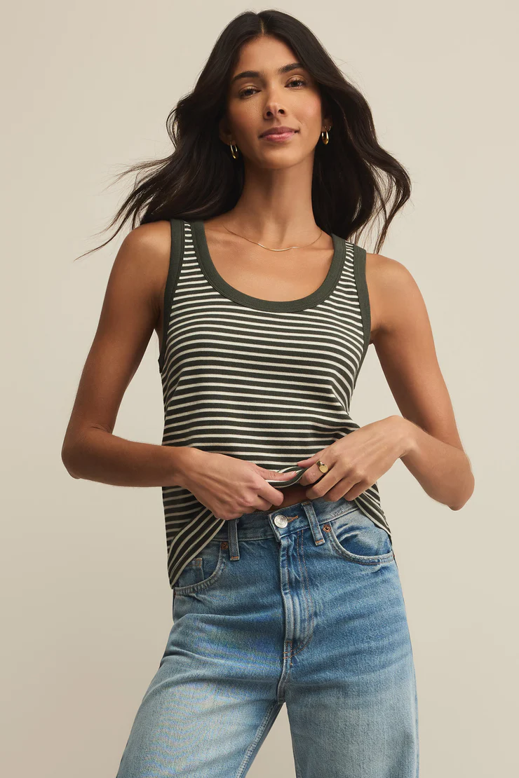 Classic with a twist, this fitted rib tank features a timeless yarn-dyed stripe and a flattering scoop neckline. Made from a comfy cotton-modal blend, it’s bra-friendly, versatile, and perfect for layering or wearing solo.