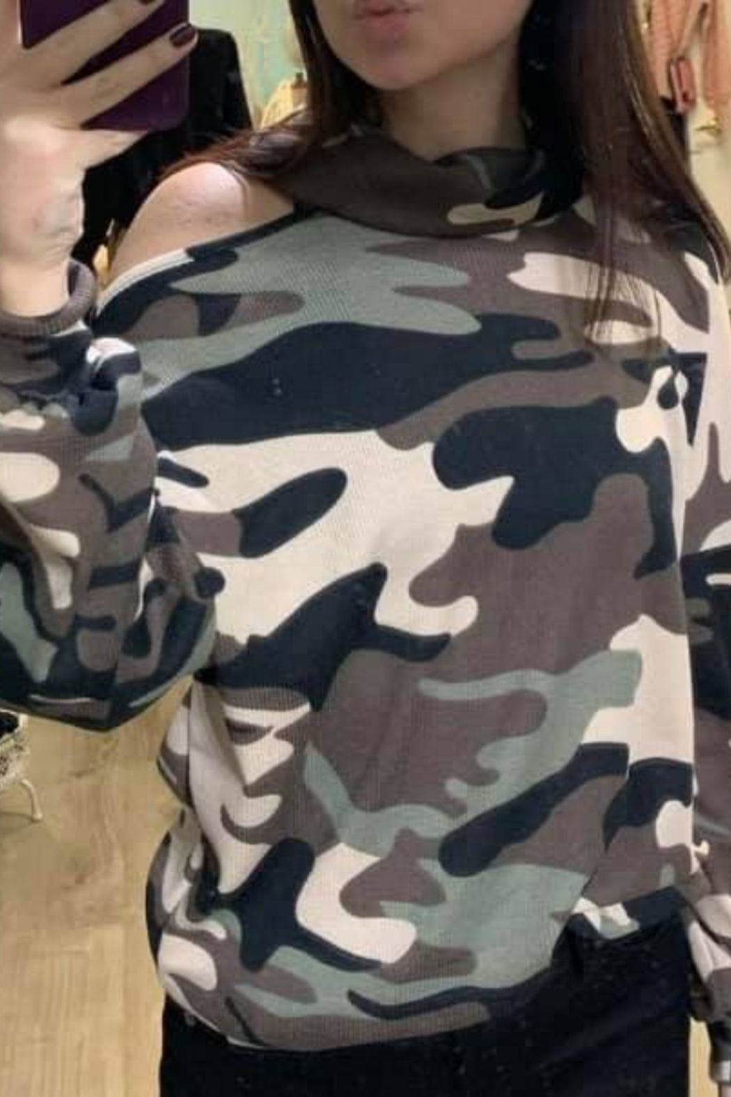 This long sleeve camo top features a turtle neck and one open shoulder. This top looks great with dark jeans and high boots!