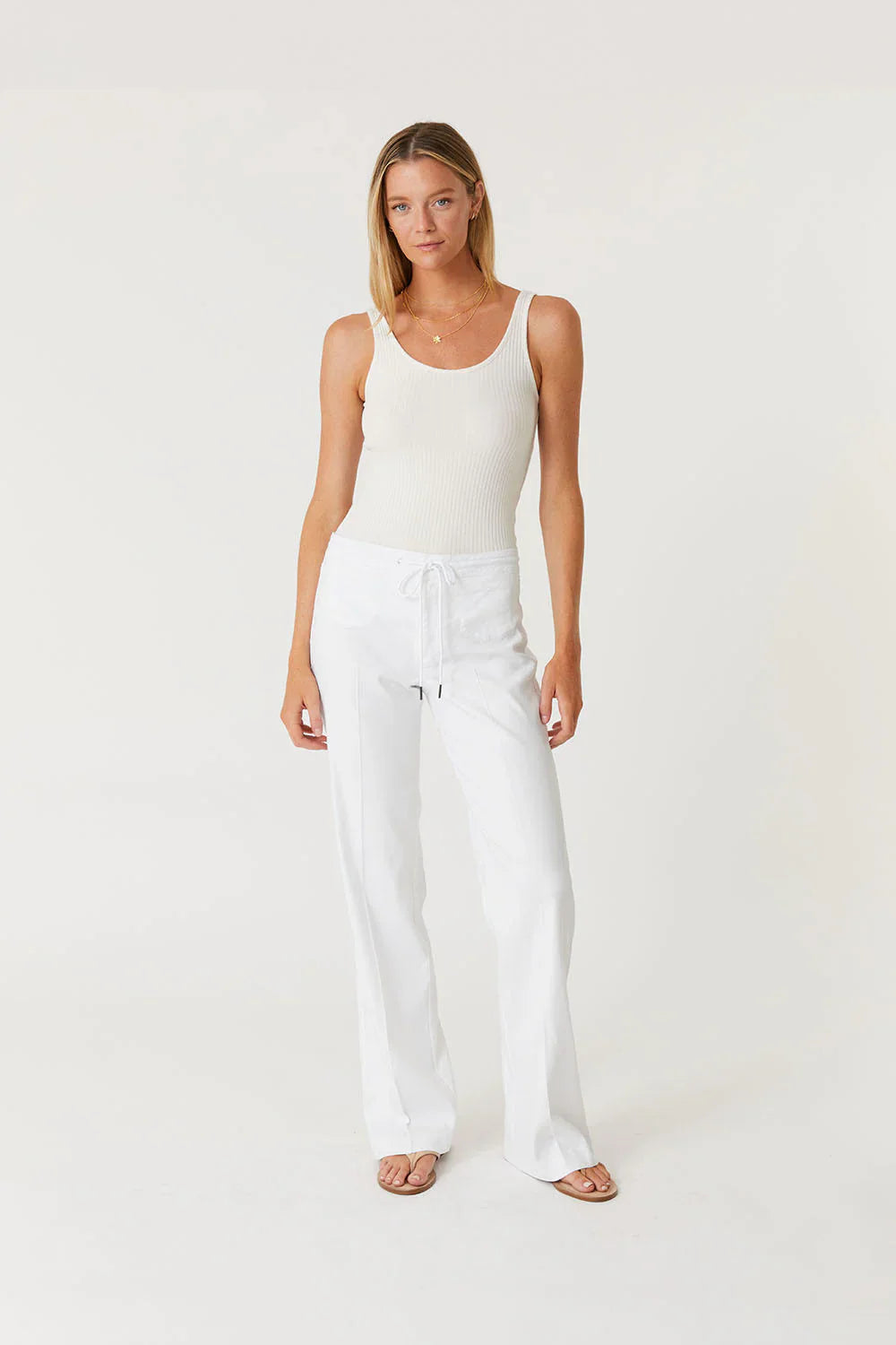 Unleash your inner free spirit with our Elliott Lounge Pant. The flared silhouette and self-tie waistband add a touch of bohemian charm, while the crisp white color exudes a sense of freshness and relaxation. Perfect for lounging in style and comfort.