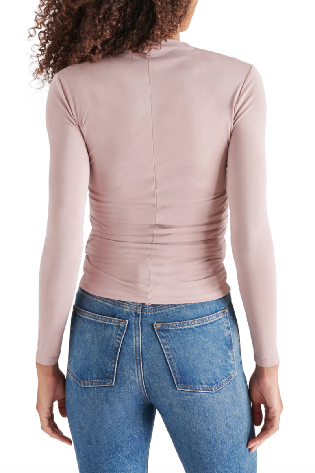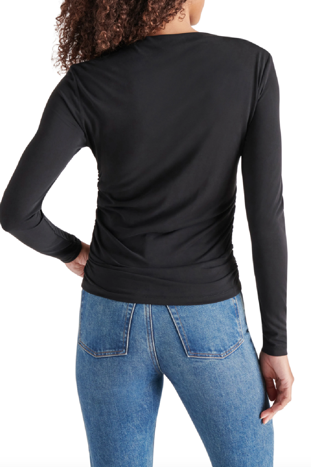 Ruching down the sides creates a figure-hugging silhouette in this simple and versatile long-sleeve top made from a soft stretch-kissed fabric.
