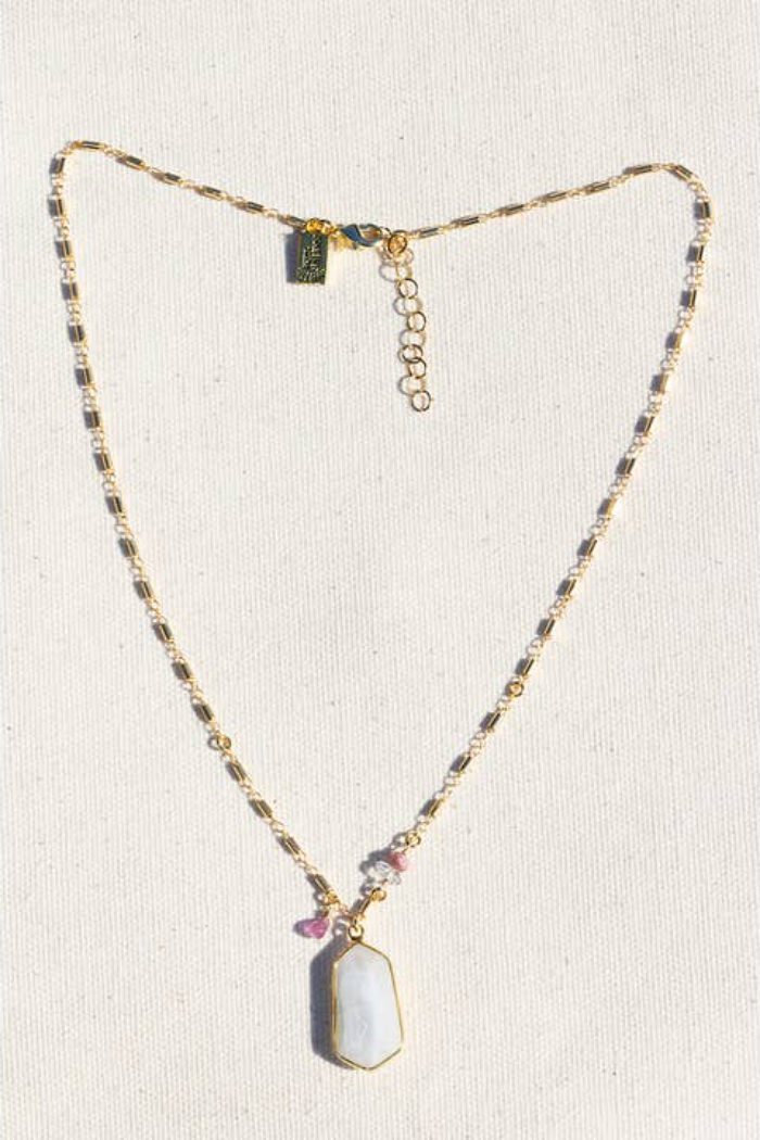 14K gold fill rainbow moonstone hexagon with tiny pink sapphire and Herkimer crystal on 16-18" necklace.