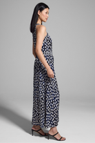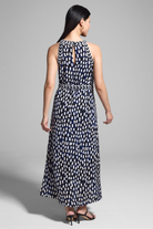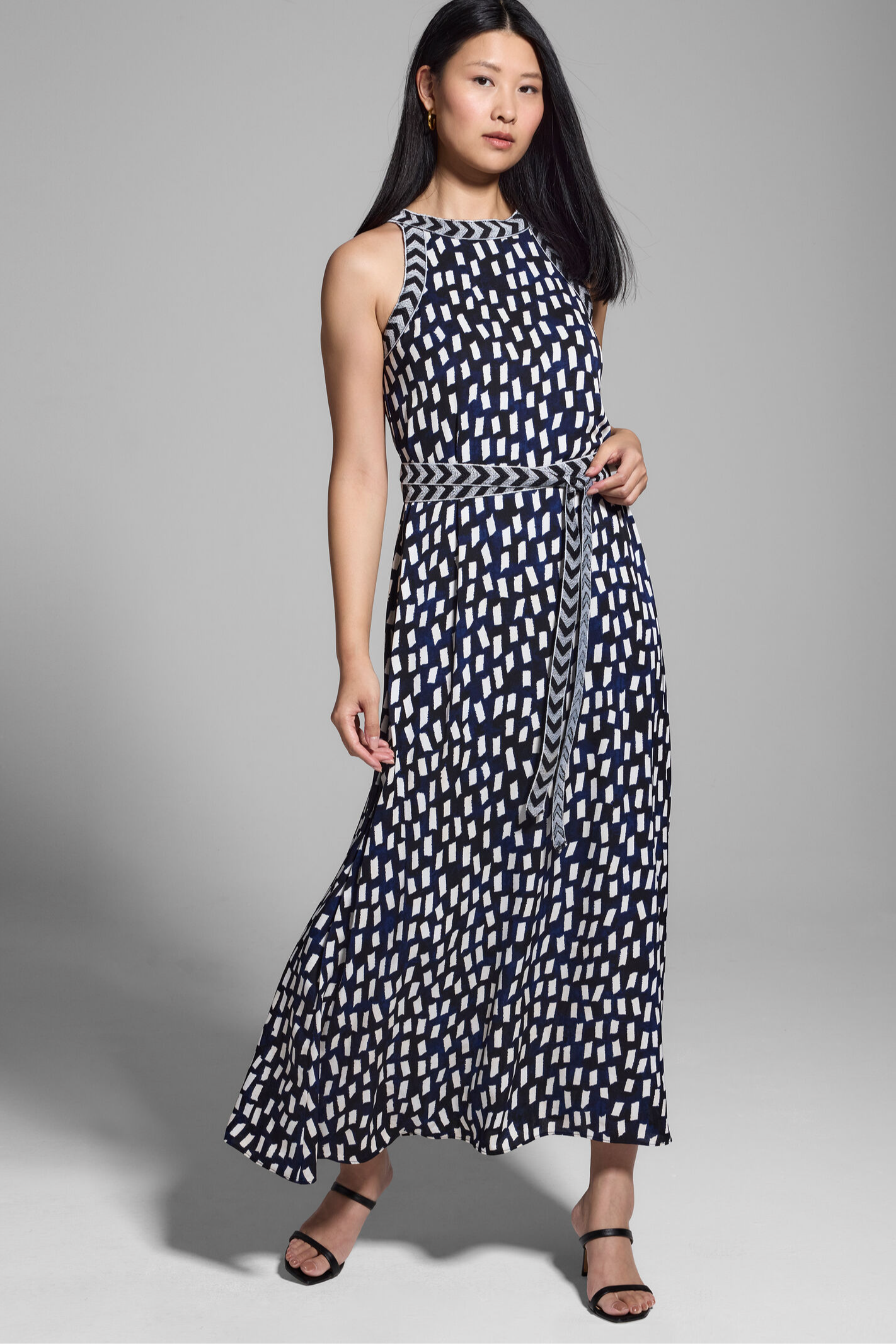 In deep shades of black and dark indigo, this sophisticated silhouette is adorned with an intricate embroidered trim and a bespoke print that evokes the beauty of a starlit night. The high neckline adds a refined touch, while the extra-long belt -- designed to wrap multiple times -- creates a striking, sculptural detail that sets this piece apart. Effortlessly elevated and endlessly enchanting, this fully lined dress is made to shine.