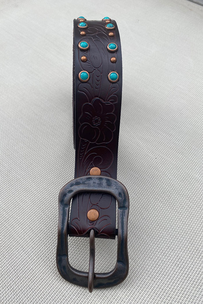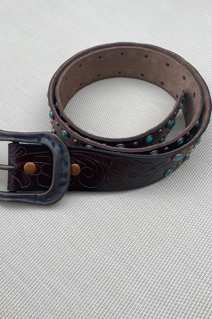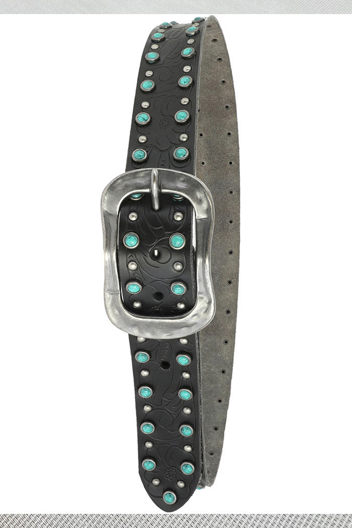 FLORAL DESIGN EMBOSSED GENUINE LEATHER WESTERN BUCKLE BELT. TURQUOISE SYNTHETIC SEMI STONE STUDDED FLORAL DESIGN EMBOSSED LEATHER WESTERN BUCKLE BELT. LENGTH: 43.5" WIDTH: 1.5" Made in China.