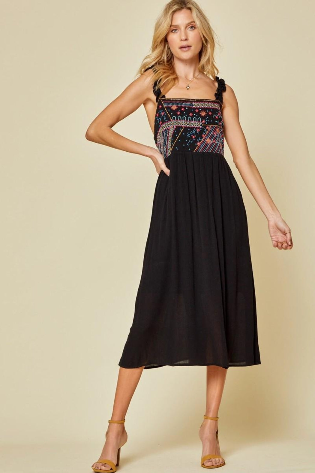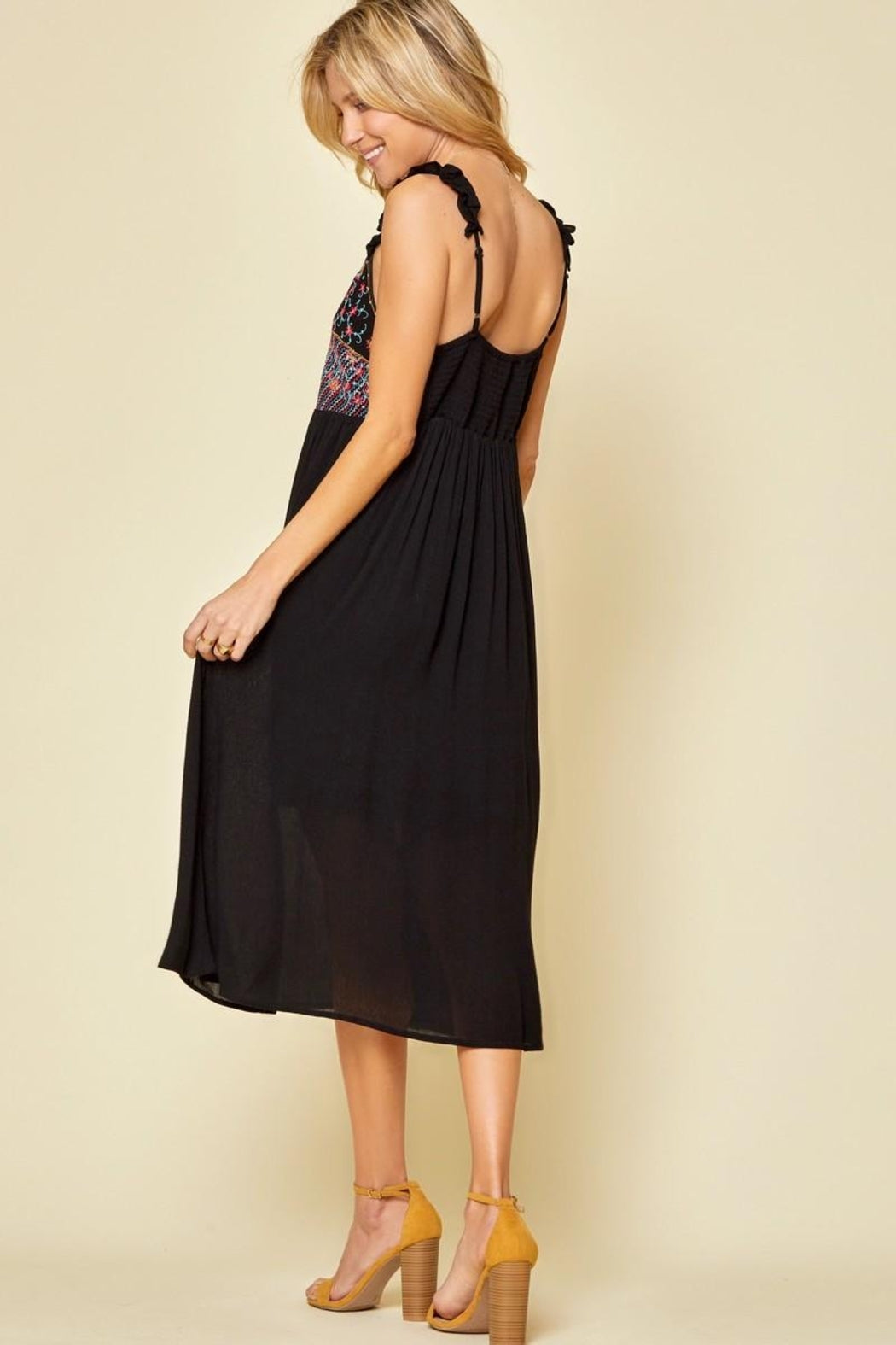 This embroidered baby doll dress is so cute for any occasion. The back of the dress features an elastic detail so if you are in between sizes you might be able to go with the smaller size depending on the size of your bust. This can be worn by itself or with a jean jacket over top if it is chillier or if you want to carry it into the fall and winter season. This is a nice black dress that is fully lined.