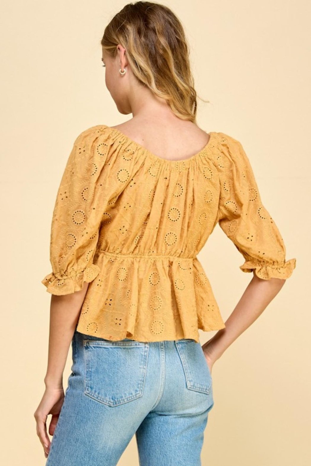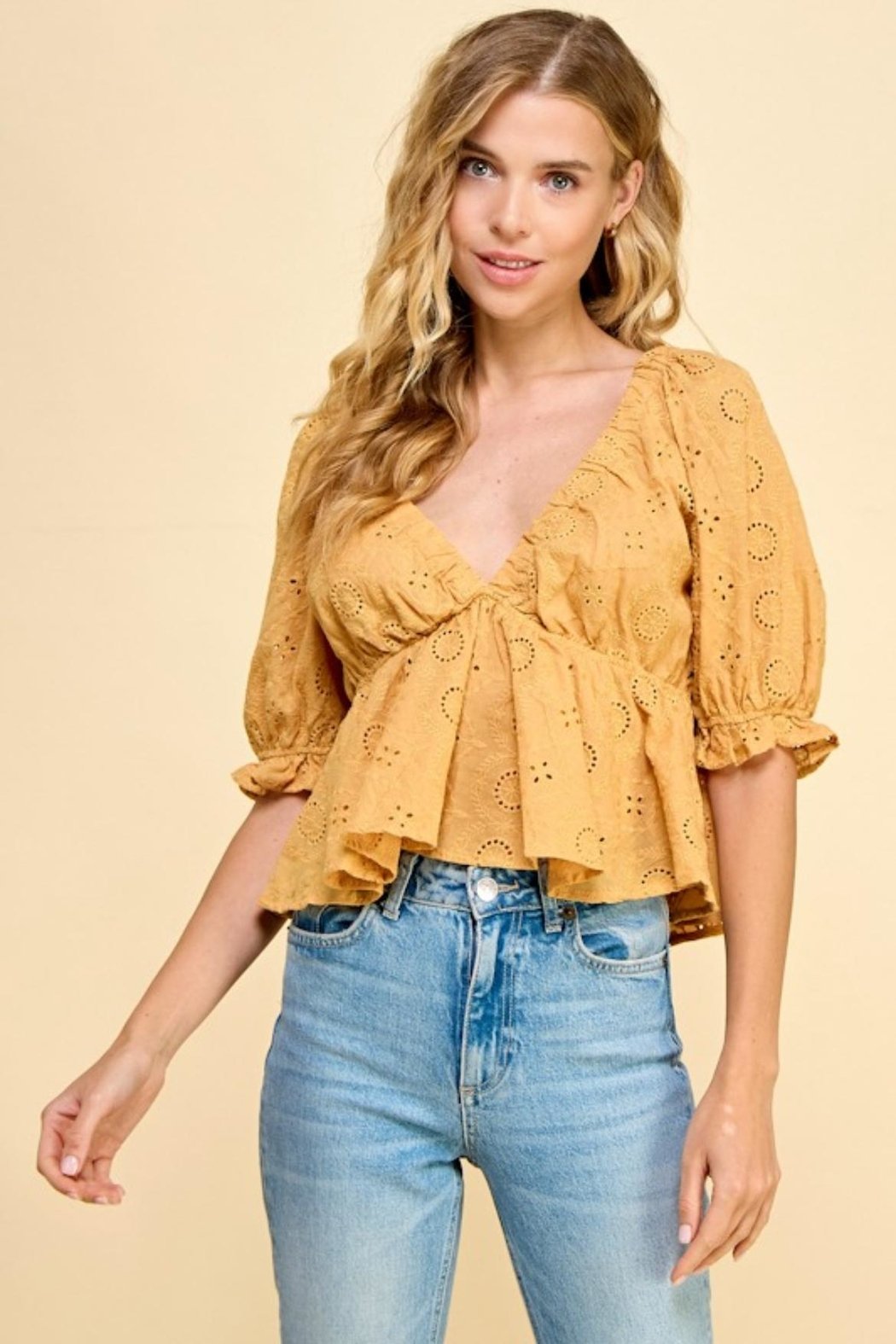 Embroidered eyelet V-neck puff sleeve peplum top. Model is wearing a size Small