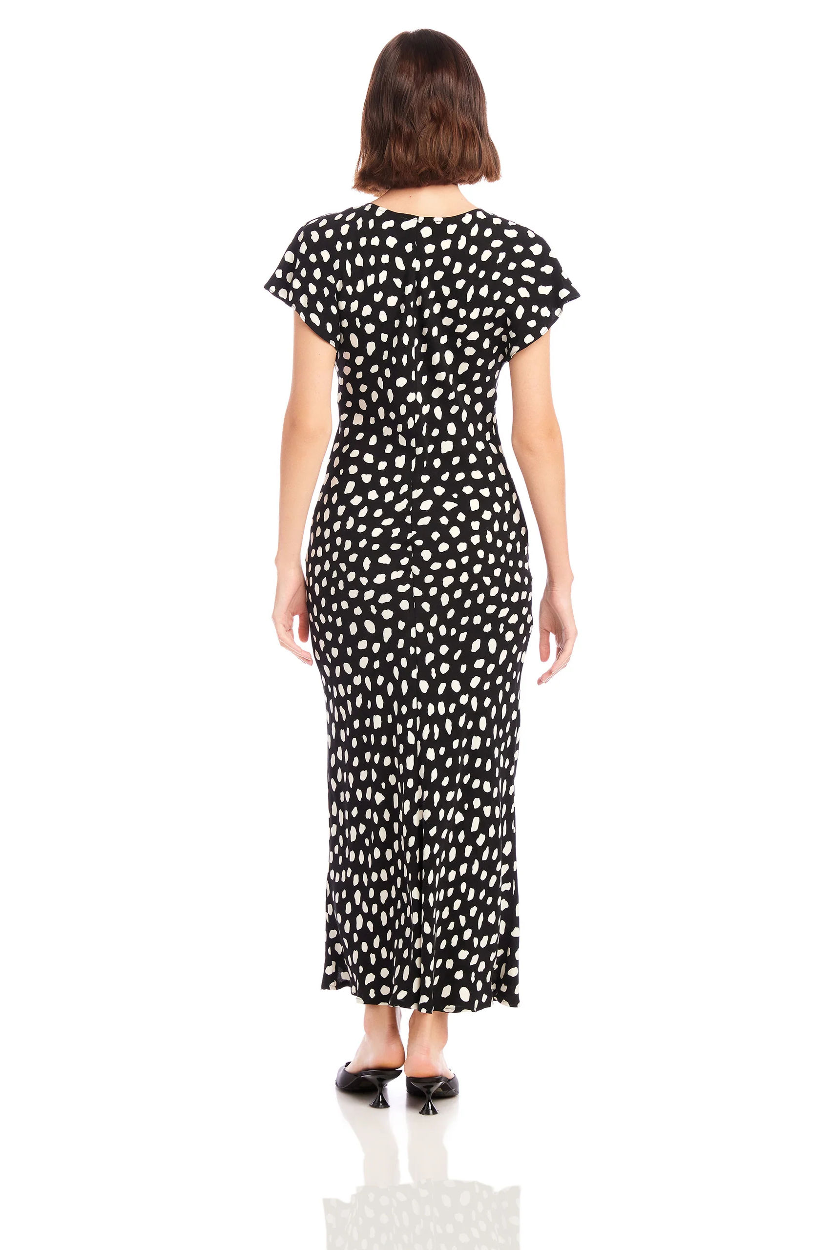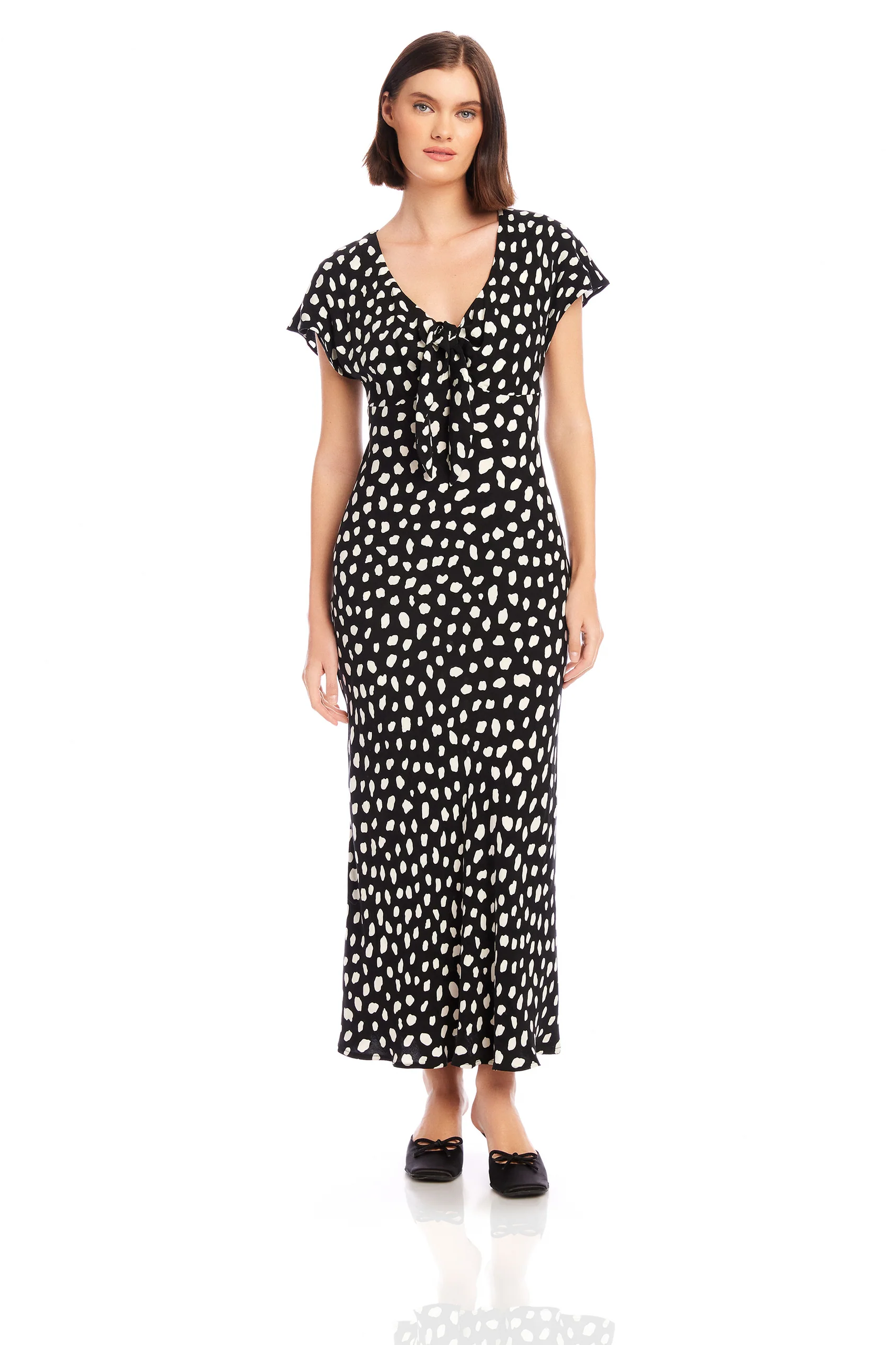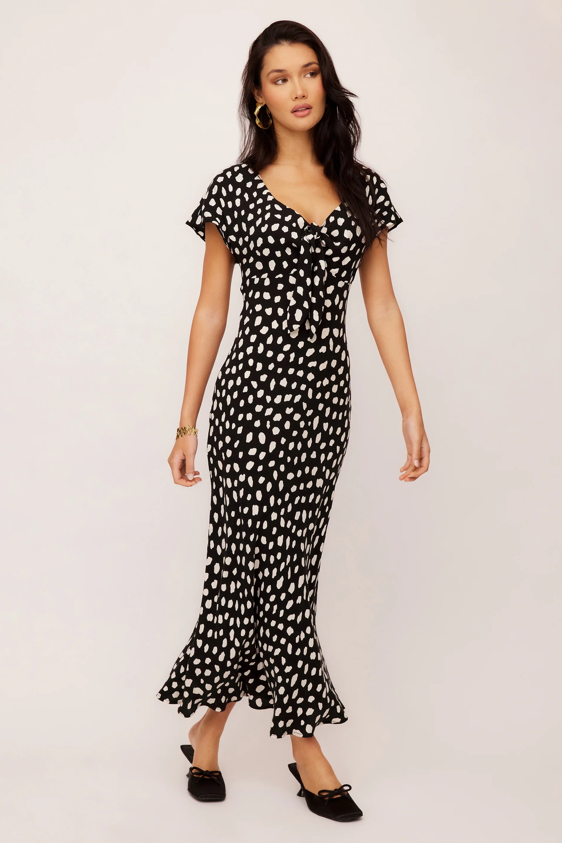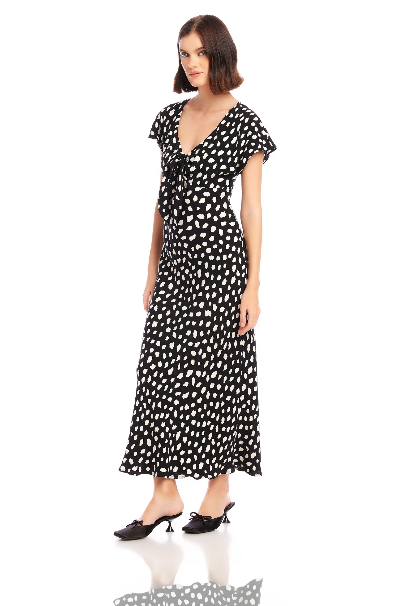 The Emmeline Dress boasts a modern take on classic polka dots with its abstract design. The bias cut and tie front detail provide a flattering fit, hugging the body in all the right places.