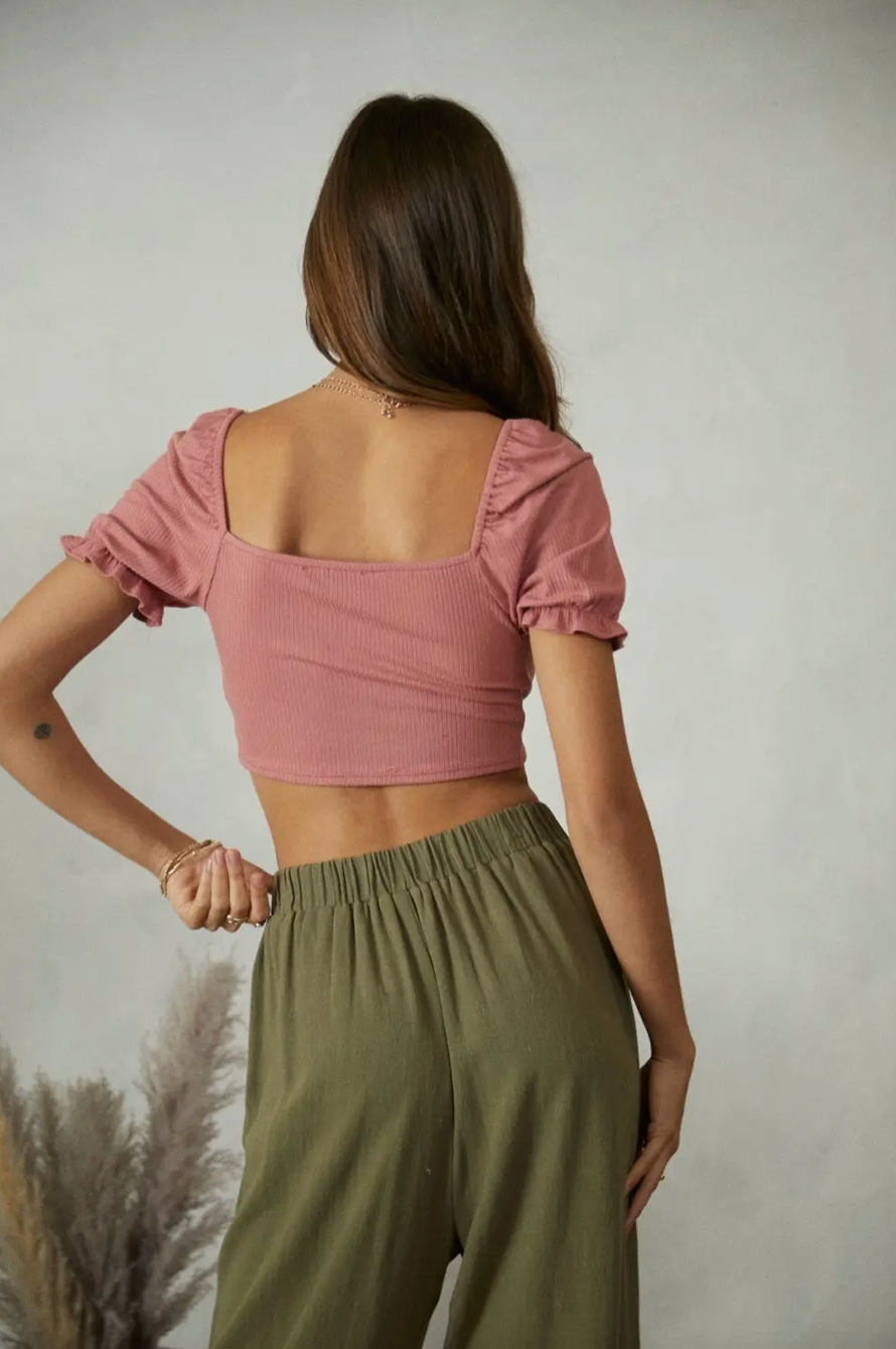 The Tina Twist Front Crop Top will always bring a cute and casual vibe to any outfit! Soft and stretchy ribbed knit fabric shapes this cute top with a V-neckline, short sleeves, and a fitted bodice with a trendy, twist front accent that continues to a cropped hem. Perfect for those warm spring or summer days ahead!