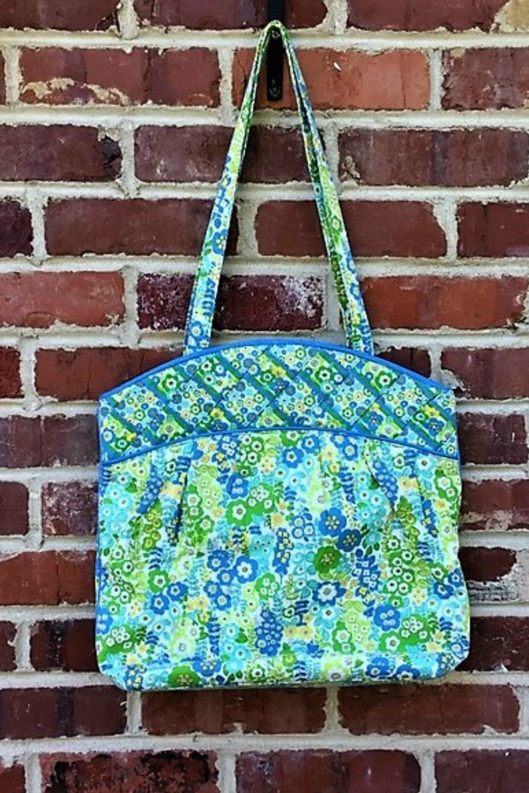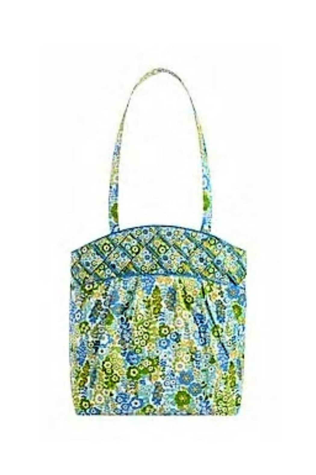 Here is the Vera Bradley Tote in the English Meadow pattern, a refreshing breath of spring! Reach for a simple all-day tote that won't let you down. Made of lightweight 100% cotton exterior, with a colorful coordinating print cotton lining. Dual carrying handles, flat bottom (removeable for laundering). Outside features lattice woven cotton detail along top section of both front and back with faux patent leather piping trim. Front has slip pocket perfect for your phone. Features two large interior slip pockets and one large zip pocket. Has tab snap fastener inside top of bag. Folds flat for storage and travel. Click on "Mimi's Gift Gallery" on this page to find other bags and accessories in English Meadow. Dimensions: 12.5" wide x 15" high x 3" deep with a 12" double strap drop.