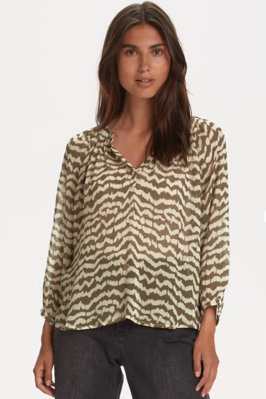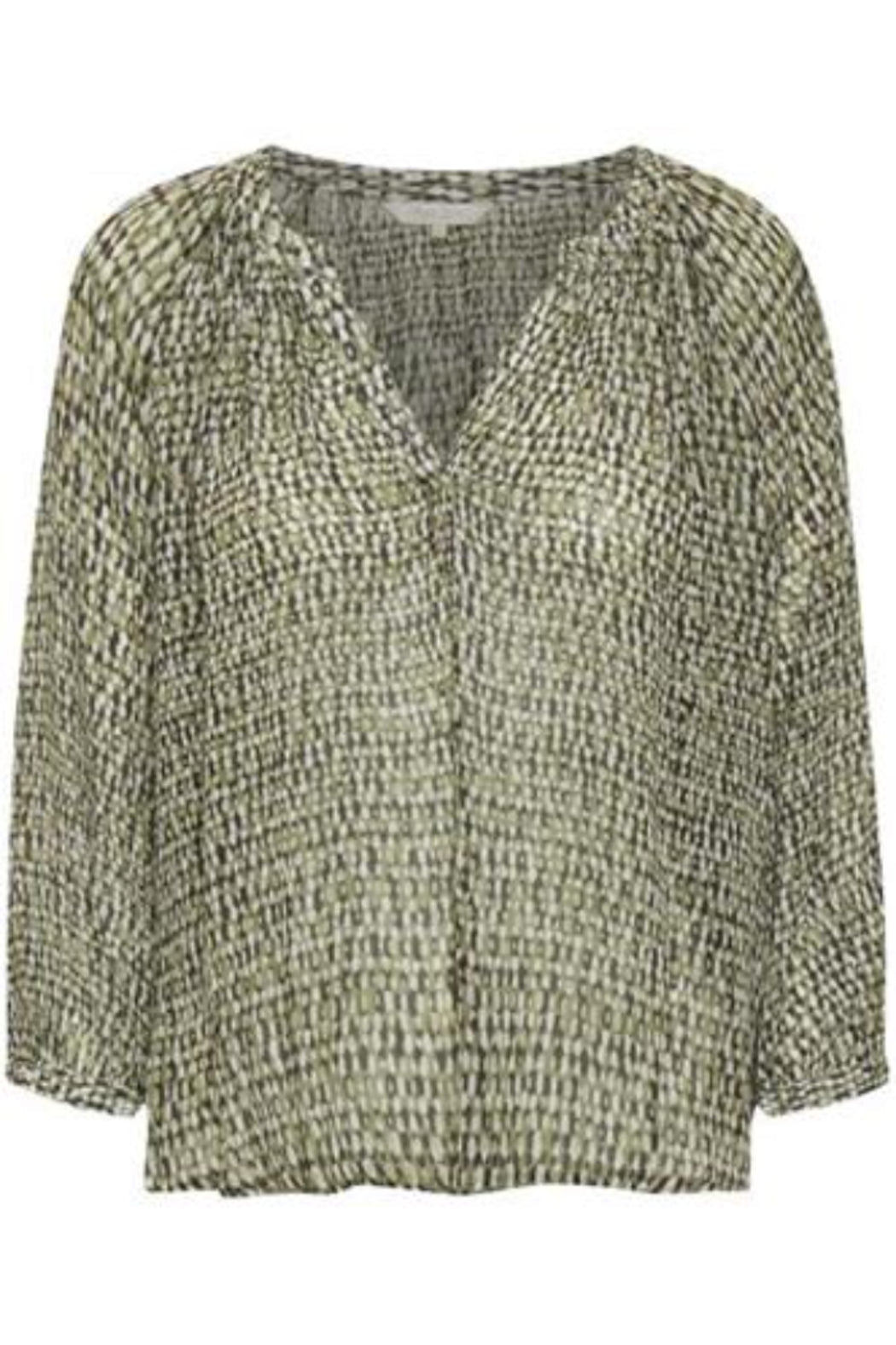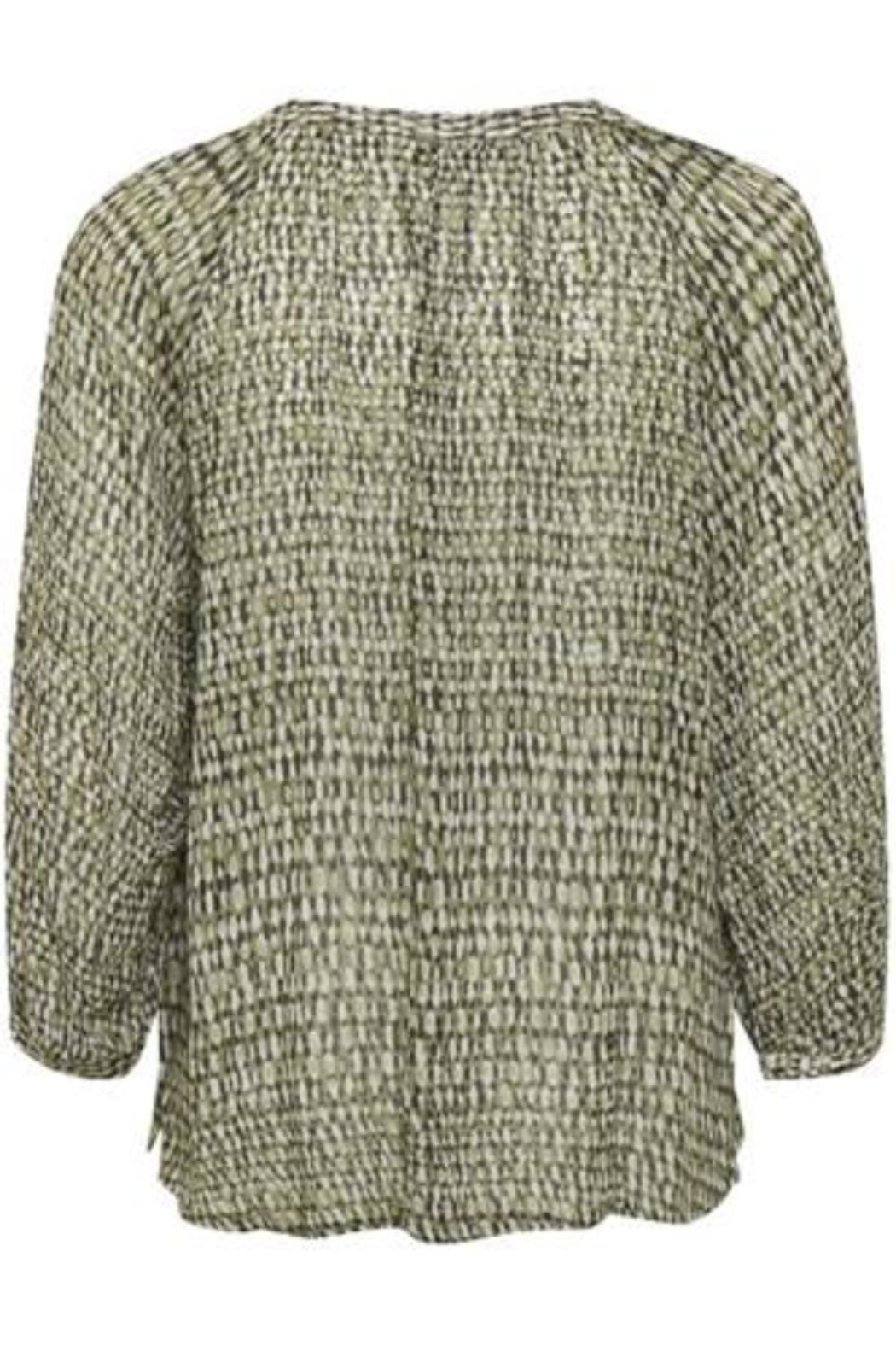 We have this top in two prints, one is Ikat and one is called blurred dots. Both are neutral and all year round. Both can be dressed up or down. Soft and flowy viscose.