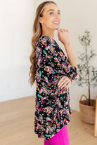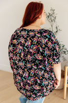 The Essentially You Top in Black Pink Paisley is the perfect blend of style and comfort. The boat neck and bat wing sleeve add a touch of elegance, while the high low scooped hem and banded sleeve cuff create a flattering silhouette. Made with bulgari fabric, this top is flowy, breathable, and oh-so-comfortable. (How can you resist?)
