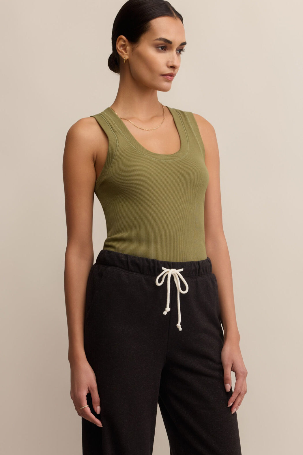 Every closet needs that tank โ the one that goes with everything and always feels just right. Our Essential Rib Tank in olive green is your go-to for layering, lounging, or living your best life on-the-go. Made from a soft, stretchy ribbed knit with a flattering scoop neckline and wide straps, it hugs in all the right places while keeping it comfy and casual.