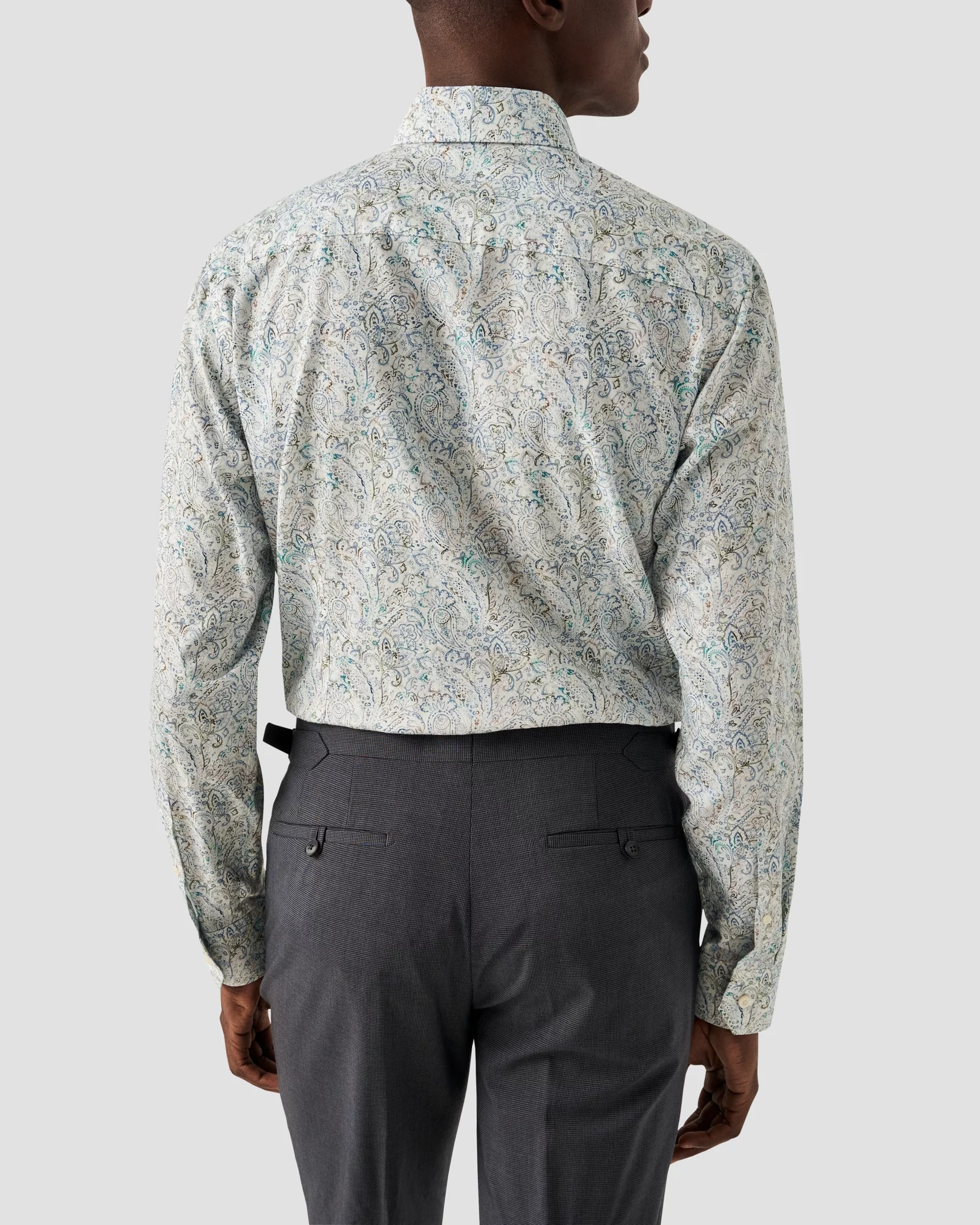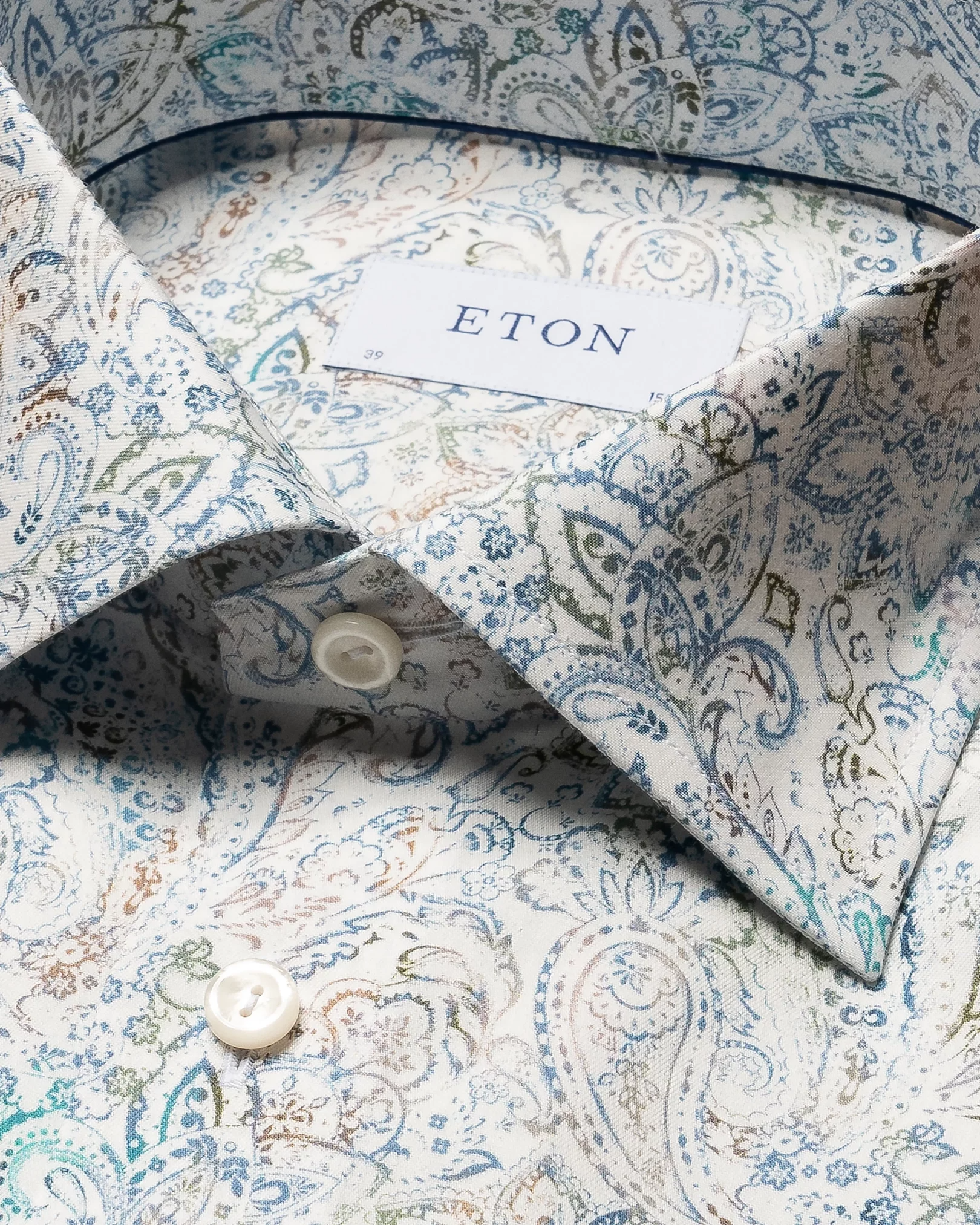 Upgrade your wardrobe with our Eton contemporary fit dress shirt. Crafted from luxury Cotton & TENCEL™ Lyocell fabric, this shirt offers outstanding softness and a silky drape. The delicate paisley print adds a touch of elegance, while standard buttons provide a classic finish.